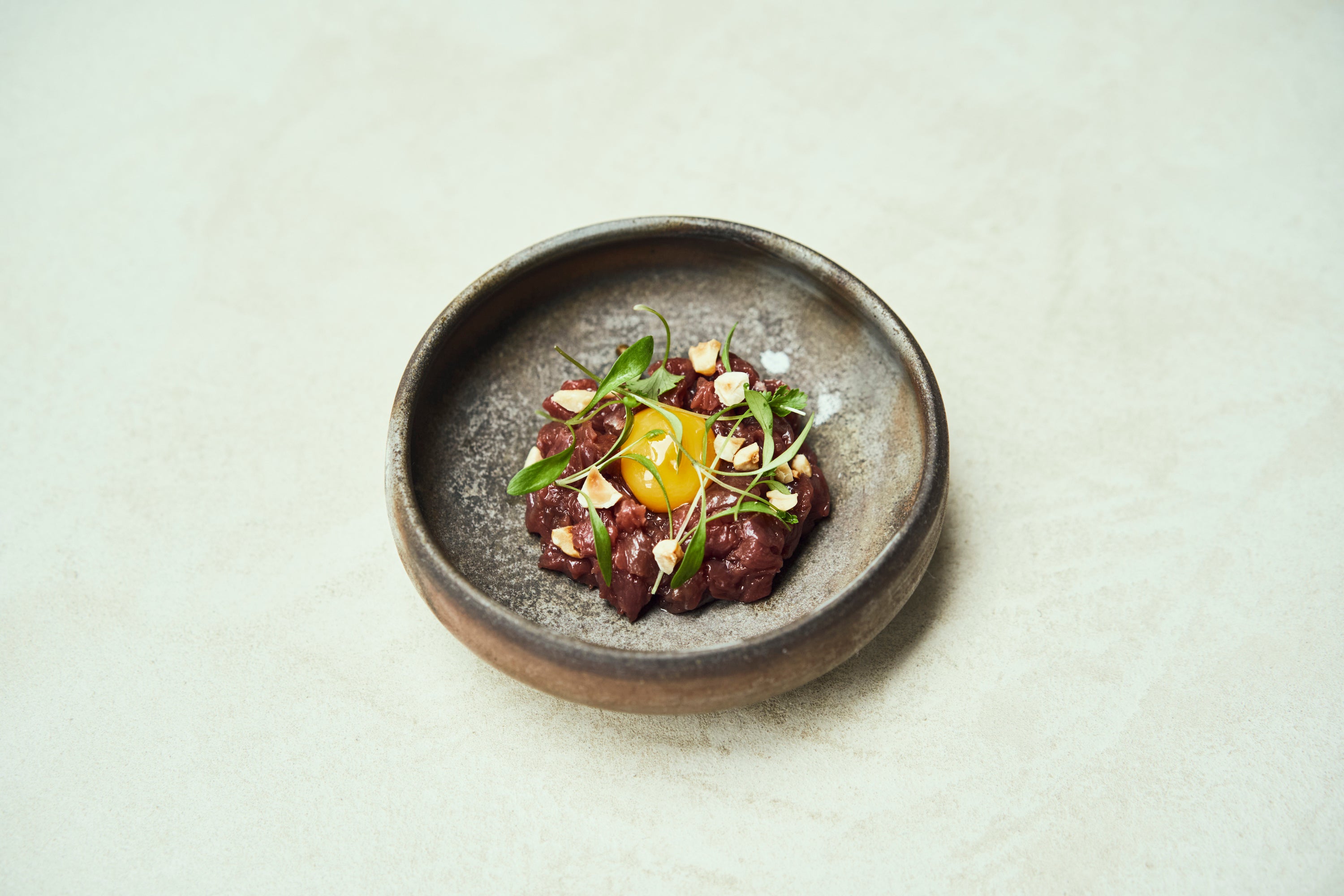 アガベシロップでマリネしたカンガルー肉を、青唐辛子、エシャロット、チリパウダーで味付けし、卵黄やコリアンダーを添えています。