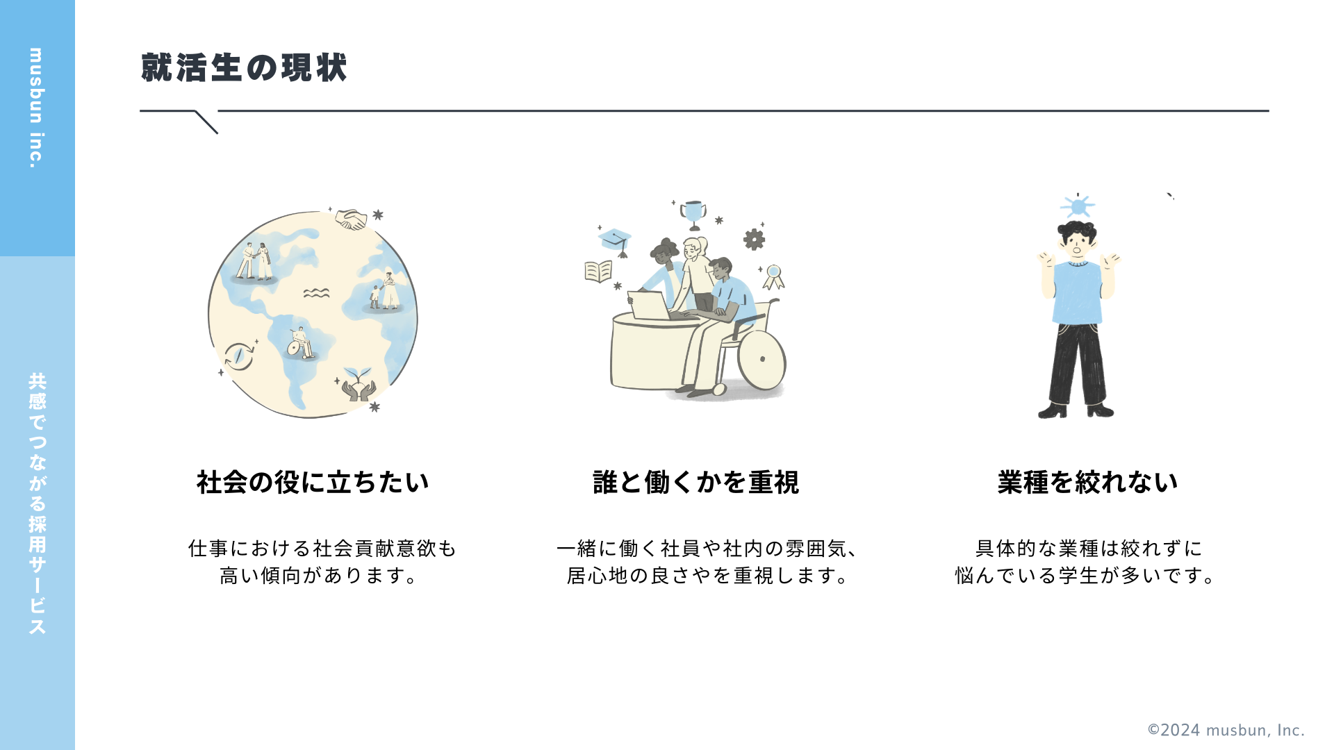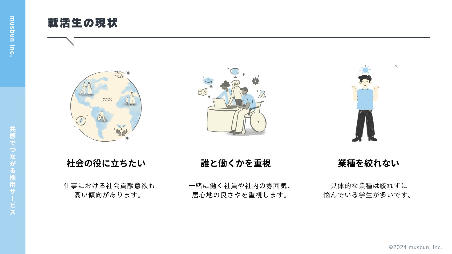 株式会社musbunは、愛知県の学生を中心に2年前に設立された企業で、地域共生社会を目指し、学生向けのボランティアアプリやキャリア教育、採用支援などを行ってきました。活動の中で、素晴らしい取組みをしている多くの企業(ニッチな分野ながら独自の技術や製品を生み出す日本有数の企業や、地域社会と密接に結びつき地域の経済を支え文化を伝承している企業、SDGsという言葉が生まれる前から積極的に資源循環に取組む先進的な企業など)と、社会貢献に意欲的な大学生と多く出会いましたが、その両者が出会える機会が少ないことに気づきました。その理由として、既存の採用支援サービスでは、知名度や資金力の高い企業に注目が集まり、それらの地域企業の取組みや魅力が大学生に伝わりづらい現状があるのではないかと考え、「興味と共感」を軸にした就活サービスの立ち上げに至りました。