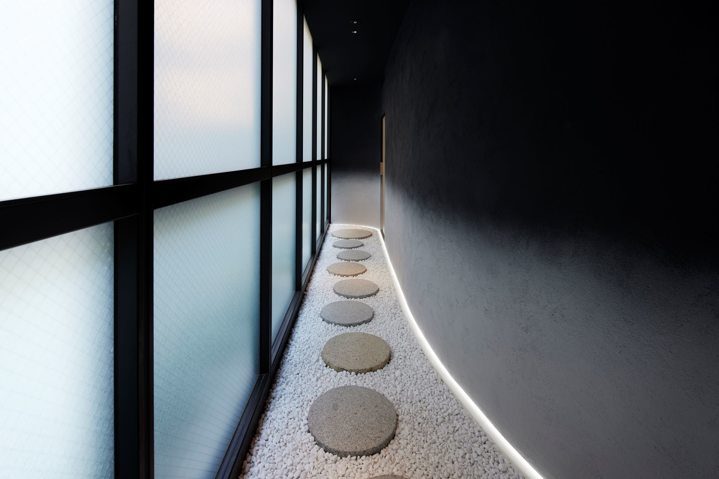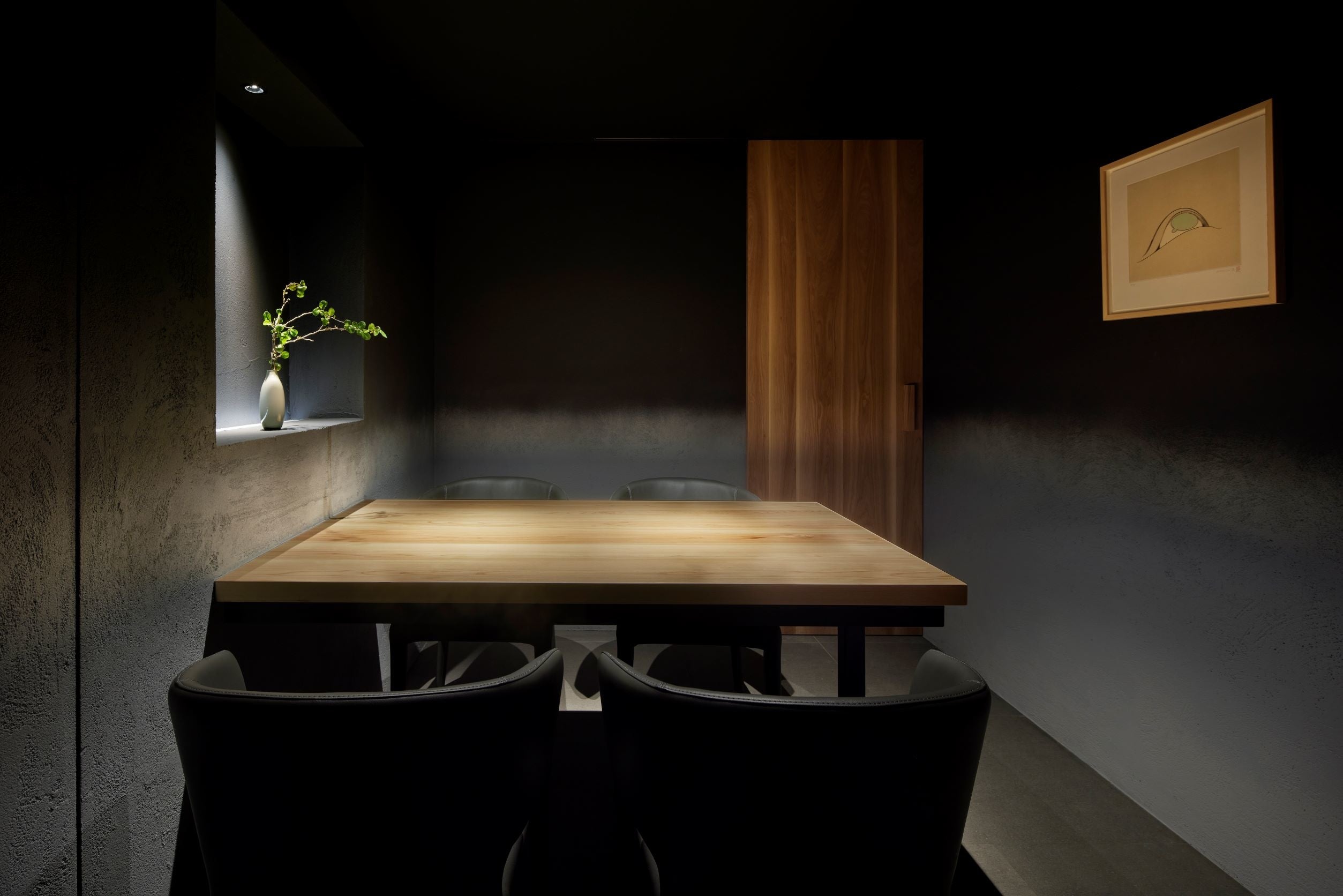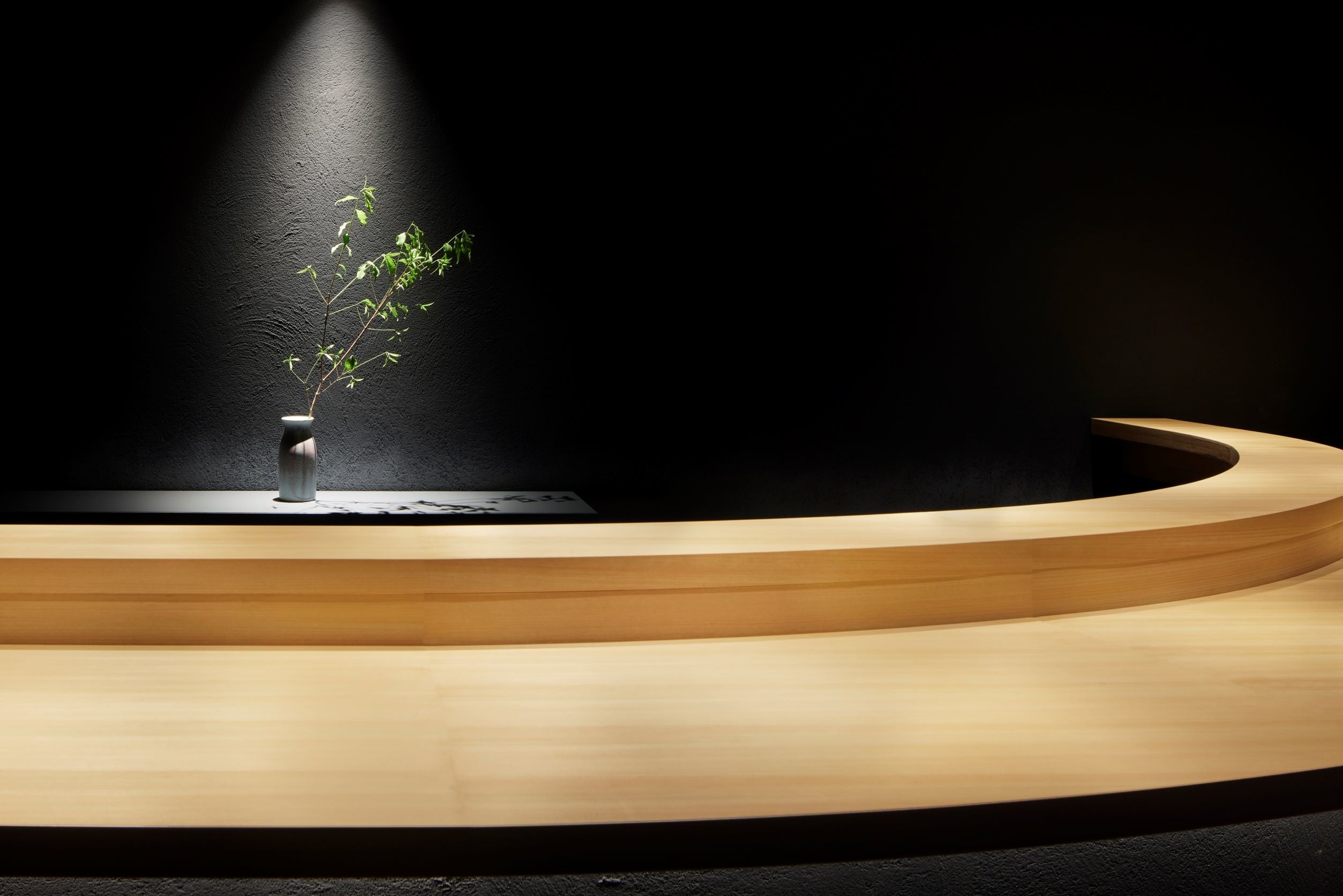 「墨色」をテーマに、研ぎ澄まされた印影のある空間を設計。曲線が特徴的な6席のカウンターと専用の導線とお手洗いを備える4席の個室が会員の方々を出迎えます。
