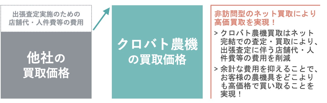 非訪問査定型のネット完結での査定・買取を行うことで、全国に店舗を設けることや人員を配置する必要がなくなるため、他の農機具買取店と比べて店舗代・人件費等の経費を大幅にカットすることを実現しました。削減した費用分を買取価格にプラスすることができるため、他店と比べて高価格での買取が可能となり、農機具の買取を希望するお客様に還元することができます。