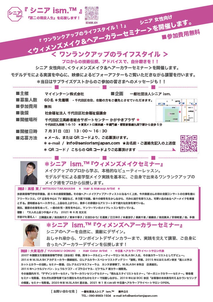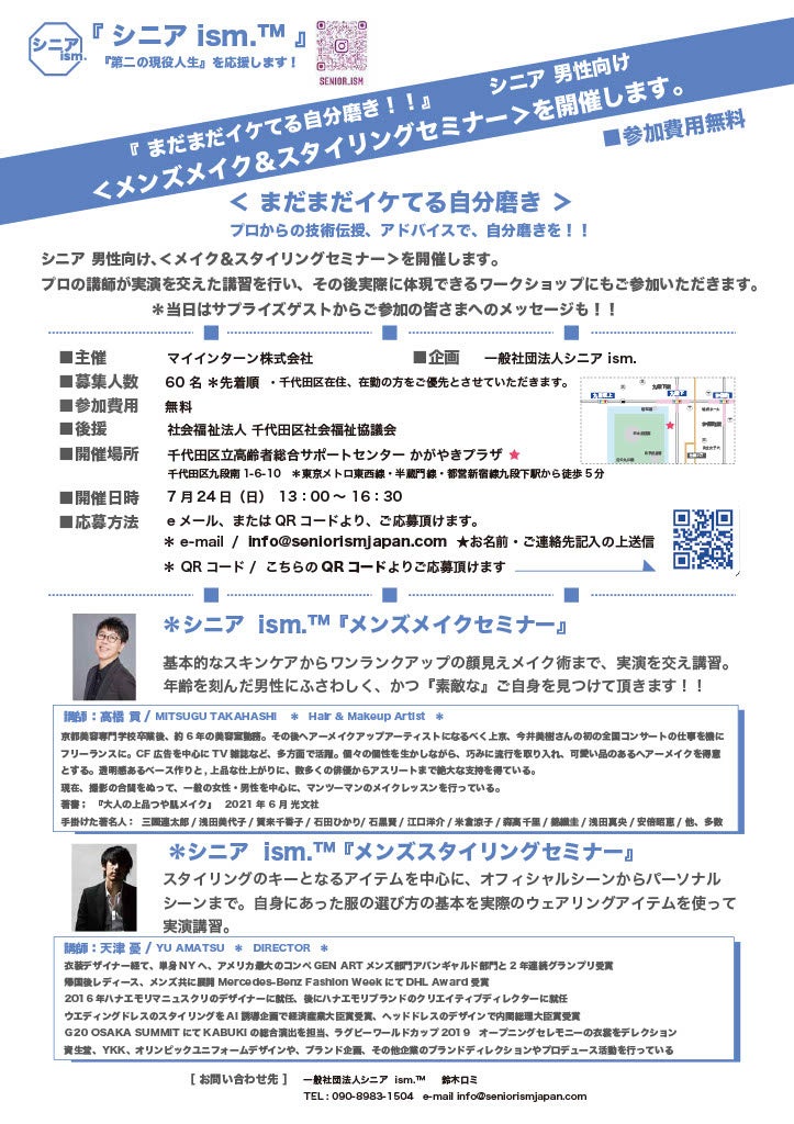 その第一弾として、ミドル・シニア世代の男性に向けたメイクアップとスタイリングの講座となります。講師は、多くの著名人のメイクアップを手掛ける高橋貢さん、ハナエモリブランドのクリエイティブディレクターを経て、独立後、ウェディングドレスのスタイリングで経済産業大臣賞を受賞するなど世界的に活躍するデザイナー天津憂さんをお迎えして無料で実施します。ミドル世代・シニア世代の男性に向けて、『これまで身近なものでなかった美容(化粧)、ファッション(着こなしスタイリング)に対し、新たな価値観をもって定年退職後の人生に前向きな一歩を繰り出してほしい 』そんな思いをもって、千代田区で開催し、シニア ism.™(シニアの流儀)ライフスタイルプログラムをキックオフします。学校卒業から定年までに働いた時間が約11万時間といわれ、他方、定年後の自由時間はそれと同じく、11万時間あるといわれており、ライフスタイルプログラムの提供を通じて、その11万時間の充実を図ります。