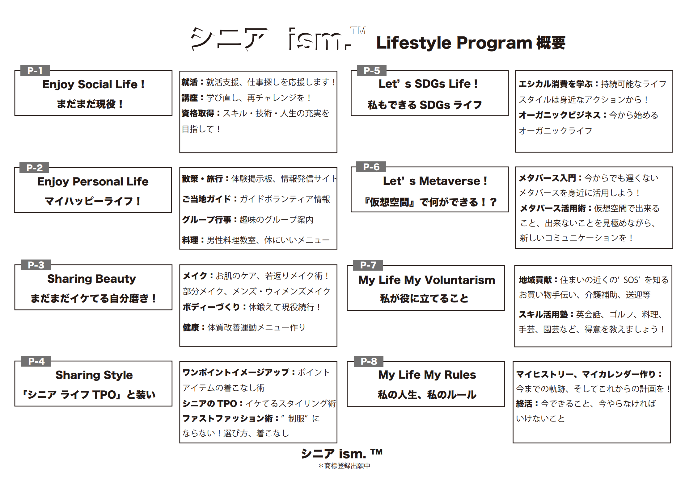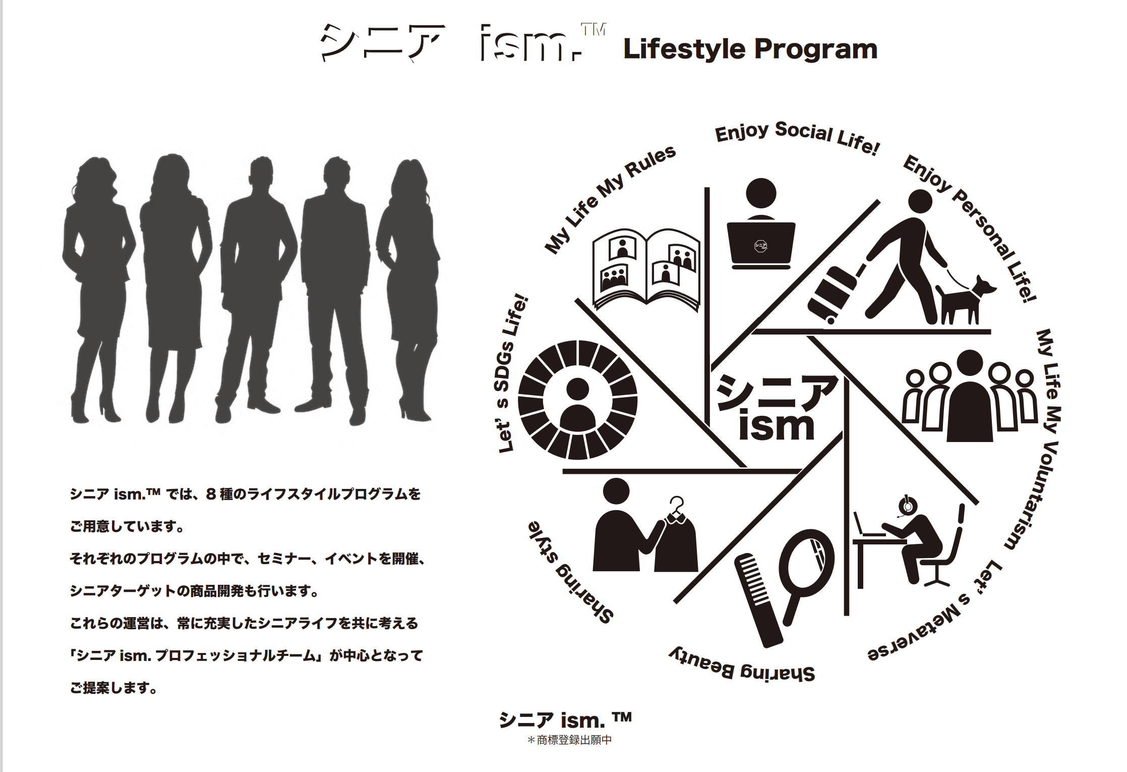 毎年100万人に及び定年対象者の「働きたくても働けない」「地域参画したくても参加することができない」といった60%以上にも及ぶ声を社会課題と捉え、シニアのニーズに応える形でシニア ism.™(シニアの流儀)プログラムとして美容・ファッション・料理などのパーソナルライフや地域参画やボランティアやメタバースなどのソーシャルライフのカテゴリーのサブスク企画を今後展開していきます。