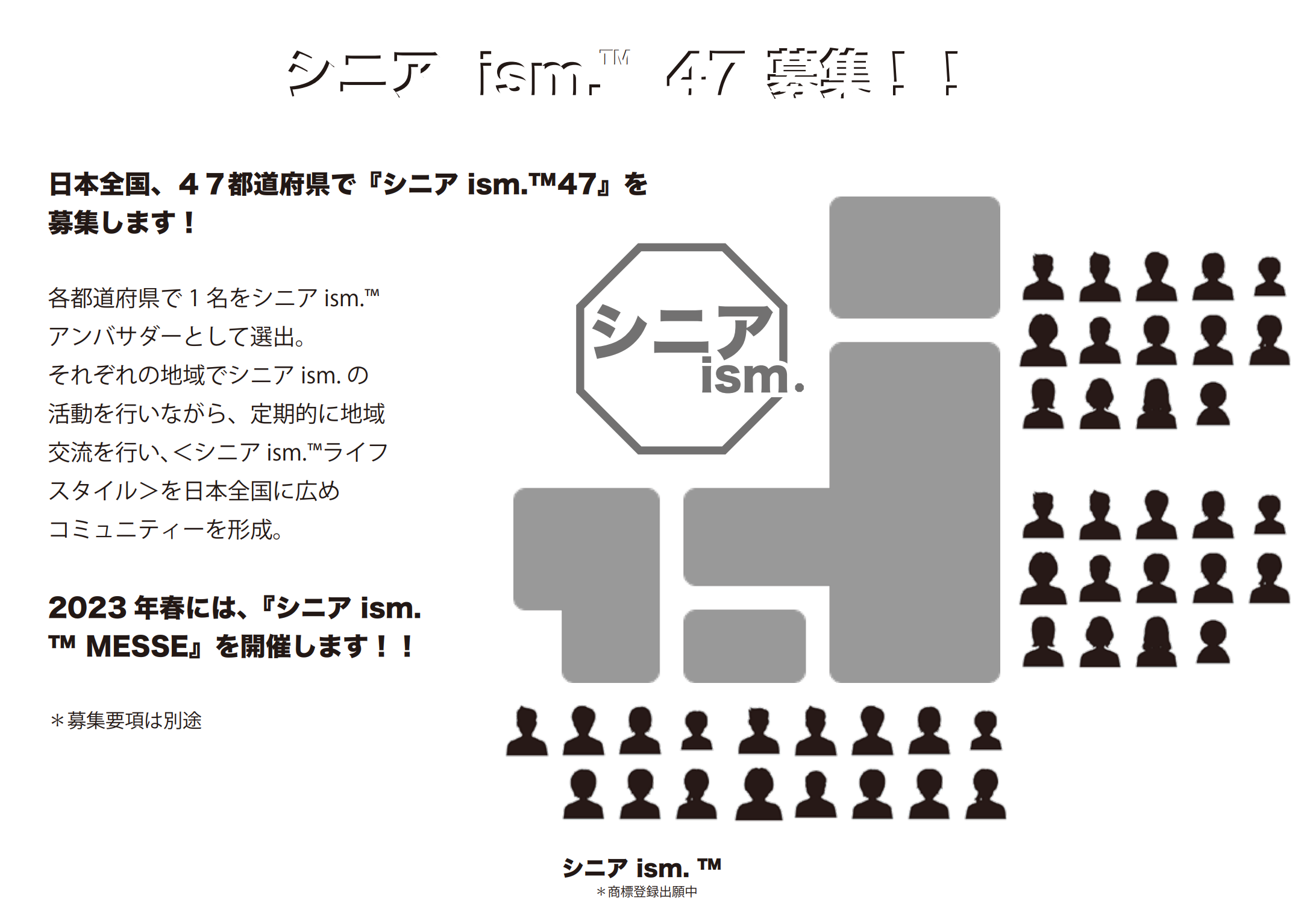 ※「シニア ism.™ 」とは、<現役シニア>と<シニア予備軍>が共に英知を結集し、 新しいシニア ライフ『第二の現役人生』を闊歩することを目的とした取り組みです。 ソーシャルライフもパーソナルライフも充実したシニア ライフを送れるように、 プロフェッショナルがアドバイスしながら、様々な角度から個々のライフスタイルの 充実、人々の交流を図りながら、人生 100 年『第二の現役人生』を応援します!!