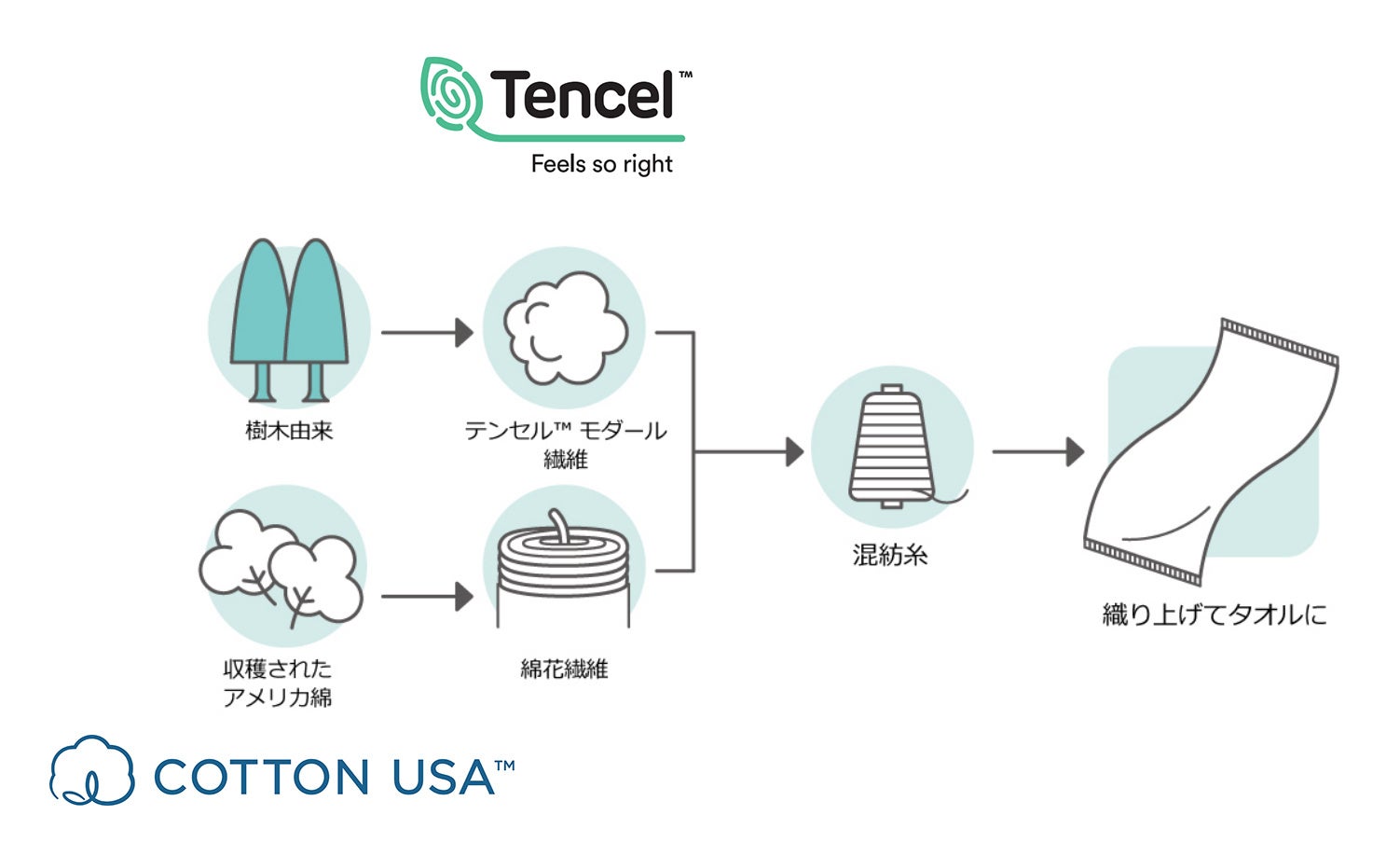 サステナブルな生産工程を採用しゼロカーボンを実現した「テンセル™モダール繊維」と、綿花の生産に関わる人々の暮らしに配慮して作られる「USAコットン」を混紡して織り上げた、地球にやさしいタオルです。