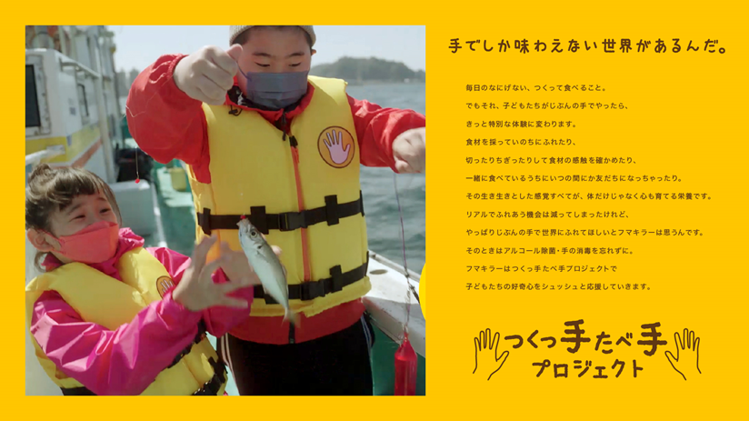 今年4月27日からスタート。リアルな体験機会が減ってしまった現代の子どもたちのために、しっかりと除菌や消毒をしたうえで、食育体験の場を提供する新プロジェクト。「手でしか味わえない世界があるんだ」をテーマに、季節ごとに様々な食事を取り上げる予定です。第一弾は子どもたちが「手巻き寿司を1からつくっ手たべ手」に挑戦。船にのって自分で釣った魚をさばき、手巻き寿司を作る動画を公開しています。