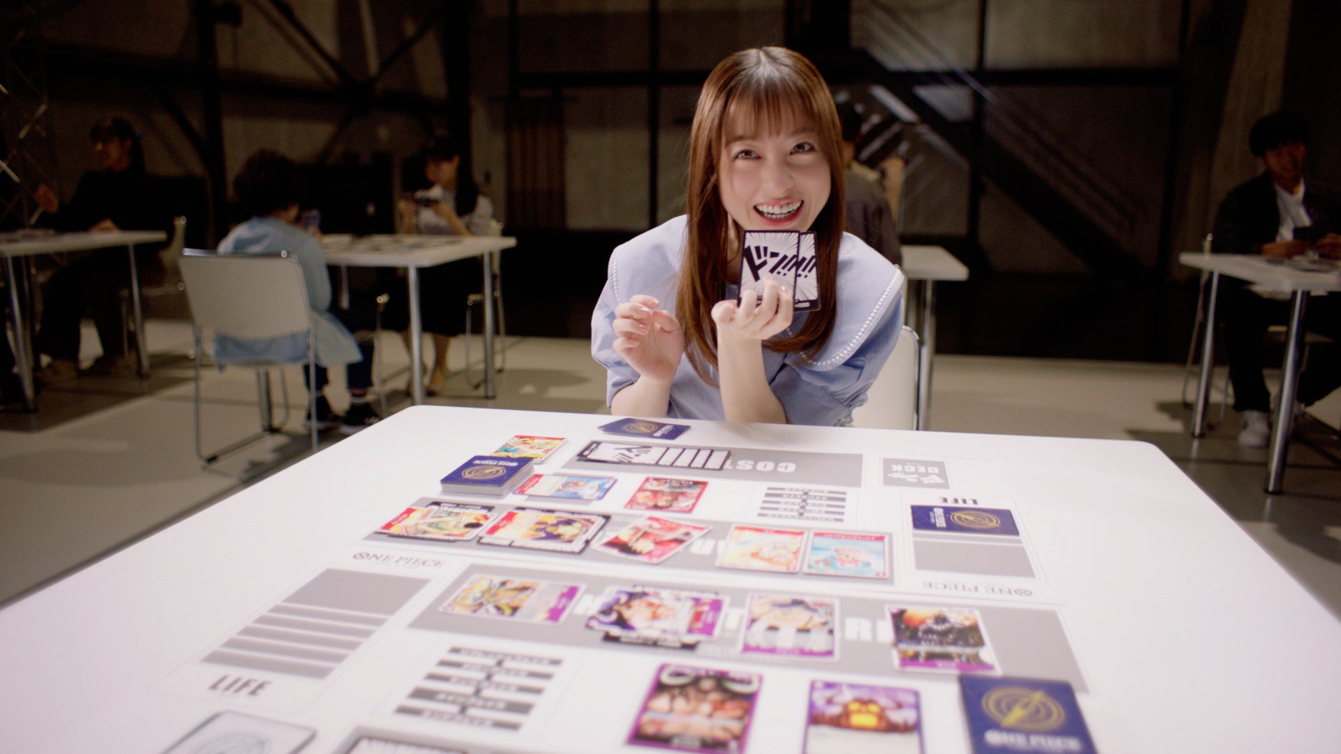 対戦中の橋本さん。相手にカイドウを出され、攻める必要のある大事な場面。ロビン、ジンベエ、チョッパー、サンジ・・・とあらゆるキャラクターから次の一手を考えます。熟考の結果、橋本さんはルフィのキャラクターカードを選択!さらに相手のリーダカード 「カイドウ」へのアタックを成功させるためにドン!!カードをつけて、速攻でアタック!その結果、勝利し、「もしかして私の勝ちだよね!初めて勝った!」と嬉しそうな様子を見せます。
