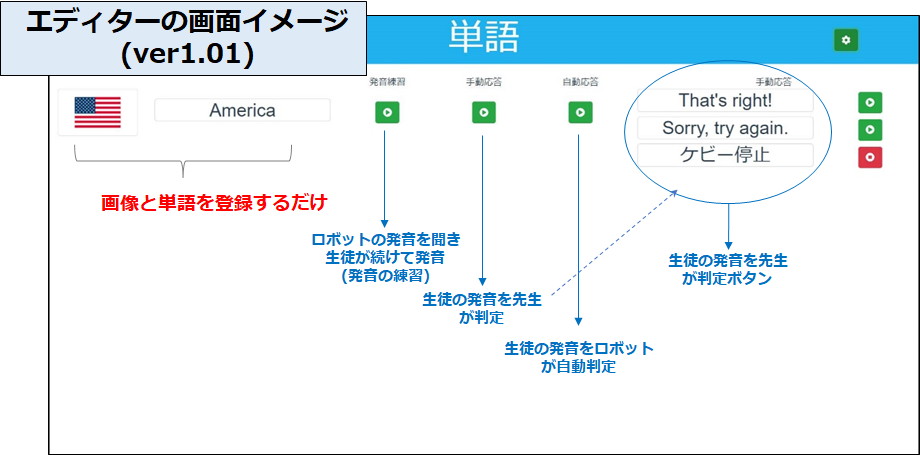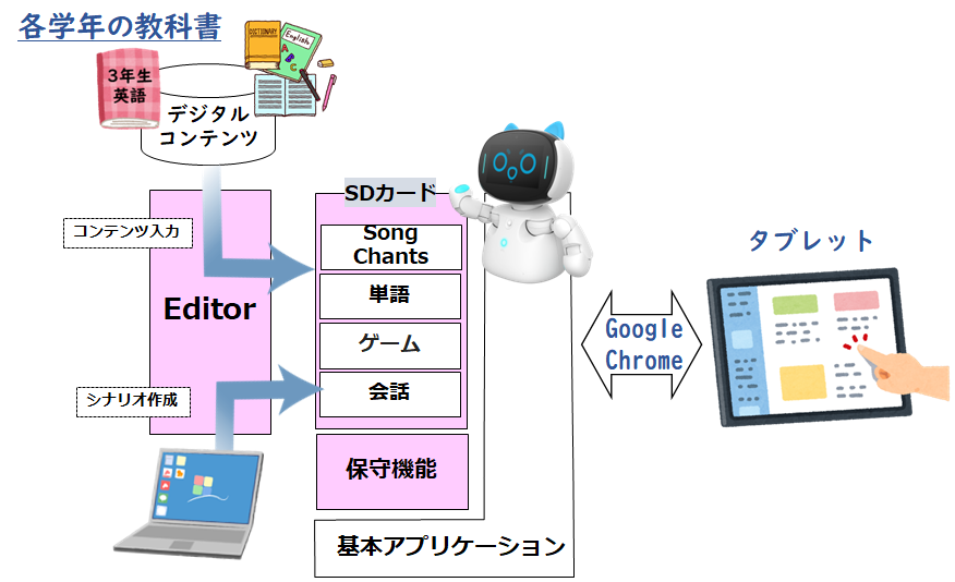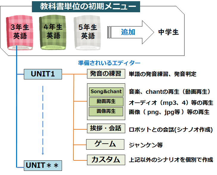 学年毎のUNIT単位での単語練習(発音での練習)、Songs&Chants(動画、画像の再生)、挨拶・会話などを簡単に作成、変更できるエディターを提供。
