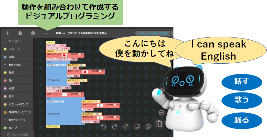 視覚的なオブジェクトでプログラミングをするビジュアルプログラミングを採用。自分が意図する一連の動作を実現するために、一つ一つの動きをどのように組み合わせるのか、どのように改善するのかを論理的に考えていく力を養うことが小学生から可能。