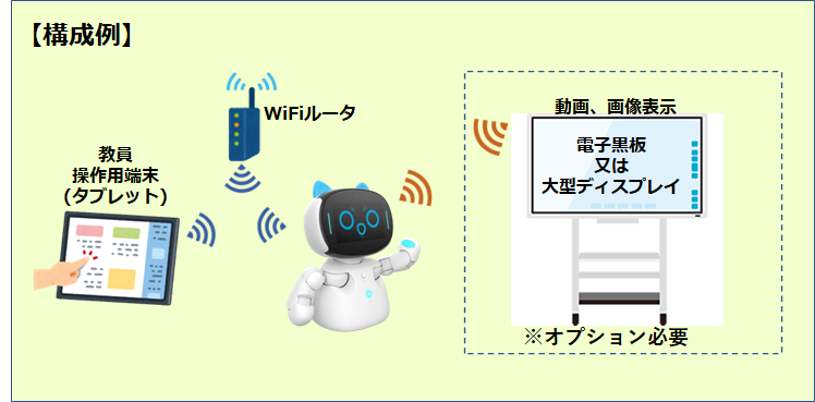 挨拶の基本パターンに加え、作成したシナリオの会話をロボットとおこない、学習内容に沿った授業が可能。