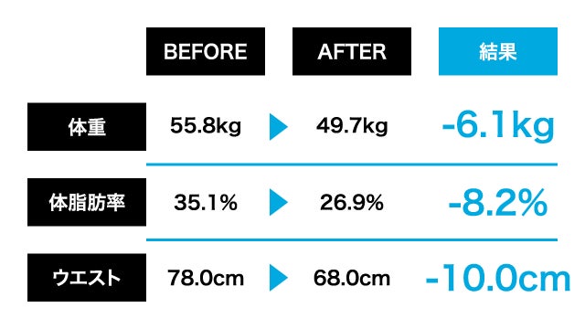 55kgから自力で落とす事が出来ずにいたのですが、指導通りに週2の筋トレと食事管理を守っていたら驚くほどスムーズに念願の40kg台になりました!筋肉を落とさずにほとんど脂肪で落とせたので、ウエストの大幅なサイズダウンができました。トレーニング初心者で迷ってる人こそパーソナルを選んで欲しいです。私は自己流で無駄にした時間をもっと早くシアンジムに費やしたかったと後悔してます。