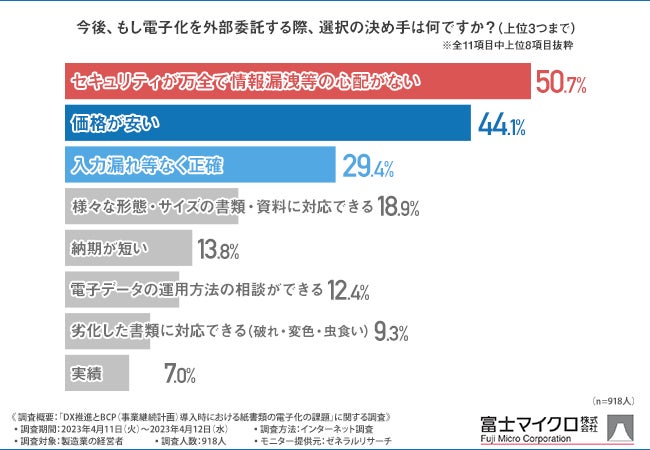 「今後、もし電子化を外部委託する際、選択の決め手は何ですか?(上位3つまで)」と質問したところ、『セキュリティが万全で情報漏洩等の心配がない(50.7%)』と回答した方が最も多く、次いで『価格が安い(44.1%)』『入力漏れ等なく正確(29.4%)』と続きました。