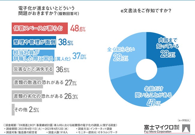 そこで、「e文書法をご存じですか?」と質問したところ、『内容まで知っている(23.3%)』『名前だけ聞いたことがある(47.4%)』『全く知らない(29.3%)』という回答結果になりました。