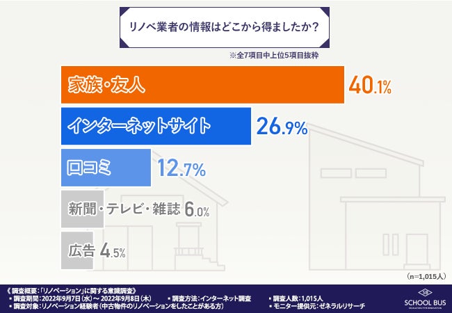 「リノベ業者の情報はどこから得ましたか?」と質問したところ、『家族・友人(40.1%)』と回答した方が最も多く、次いで『インターネットサイト(26.9%)』『口コミ(12.7%)』と続きました。