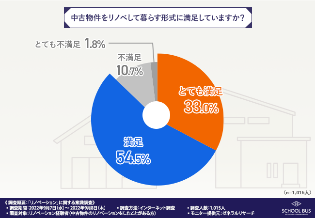 「中古物件をリノベして暮らす形式に満足していますか? 」と質問したところ、『とても満足(33.0%)』『満足(54.5%)』『不満足(10.7%)』『とても不満足(1.8%)』という回答結果になりました。