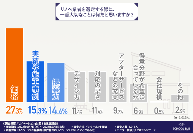 「リノベ業者を選定する際に、一番大切なことは何だと思いますか?」と質問したところ、『価格(27.3%)』と回答した方が最も多く、次いで『実績や施工事例(15.3%)』『提案力(14.6%)』と続きました。