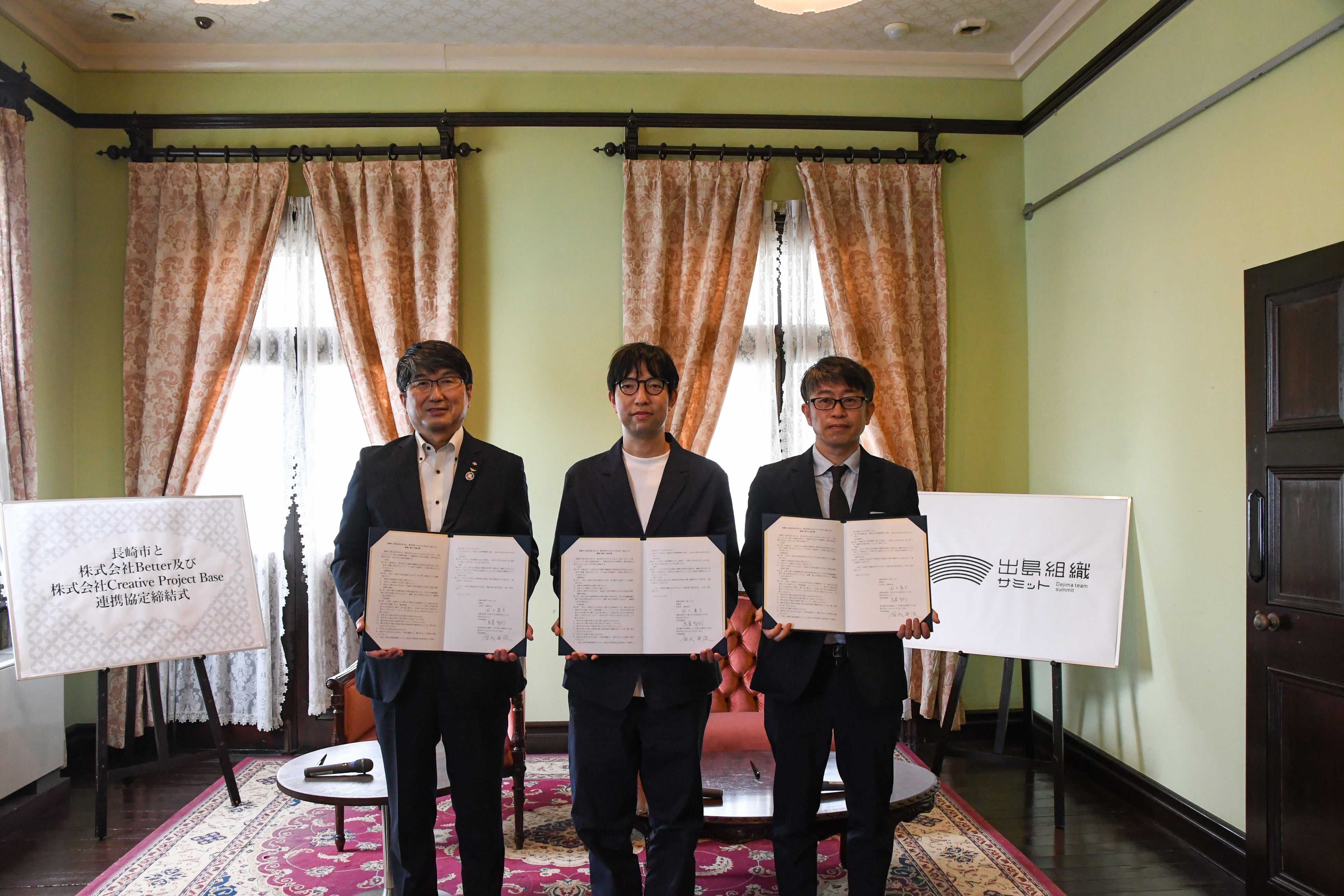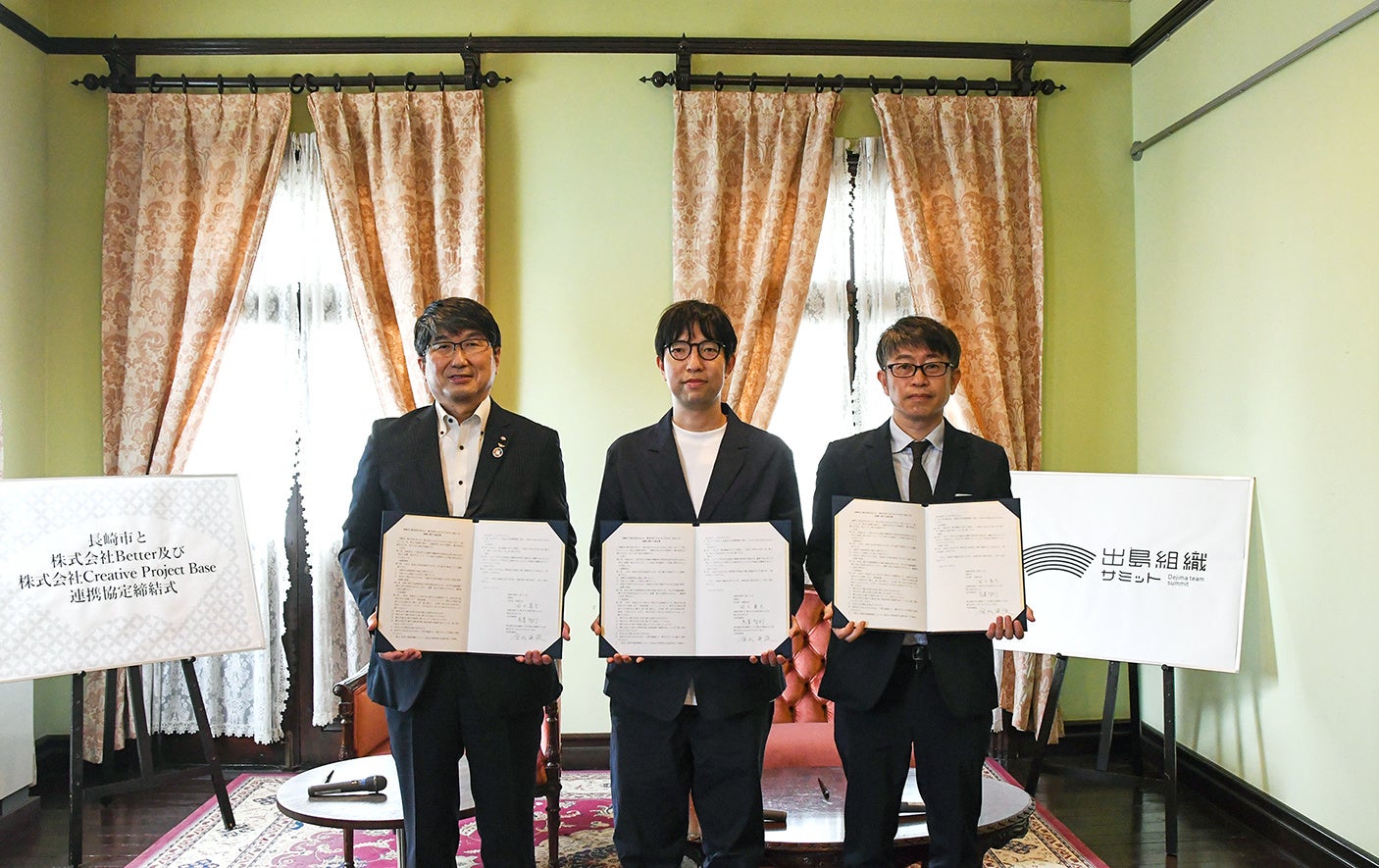 「21世紀の交流都市」の実現を目指す長崎市は、株式会社Betterと株式会社Creative Proejct Baseと連携協定を締結しました。長崎と東京に拠点を置き、世界中の企業や自治体とのプロジェクトに取り組む両社の知見を生かし、長崎市の情報発信強化や交流人口・関係人口の創出に取り組みます。連携協定の締結式では具体的な取り組みとして2022年11月12日に実施する「出島組織サミットin出島」の開催を発表。長崎市が有する出島という資産を活用しながら全国への情報発信や、企業とのネットワークづくりなどに取り組みます。