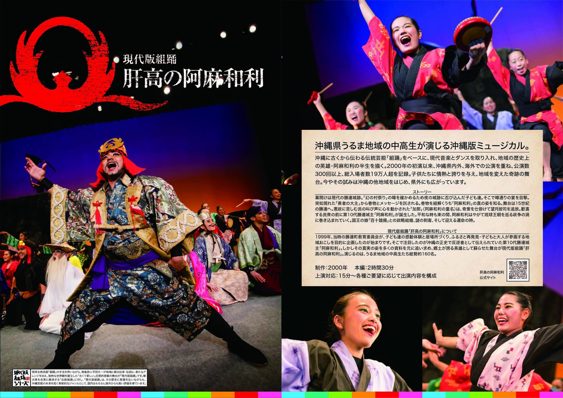 沖縄県うるま市の中高校生が出演する、沖縄に古くから伝わる伝統芸能「組踊」をベースに、現代音楽とダンスを取り入れて、勝連城10代目城主「阿麻和利」の半生を描く「沖縄版ミュージカル」。
