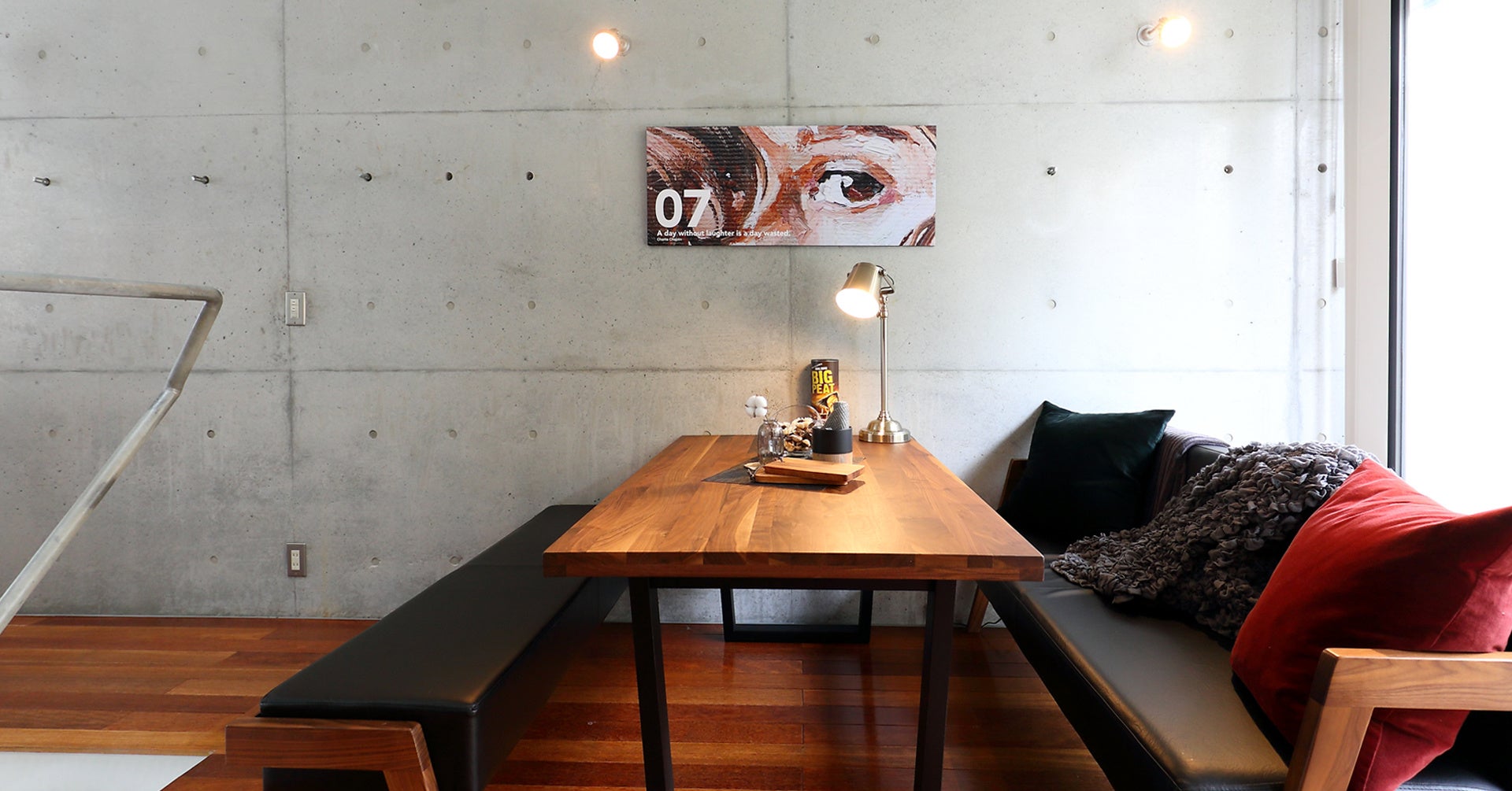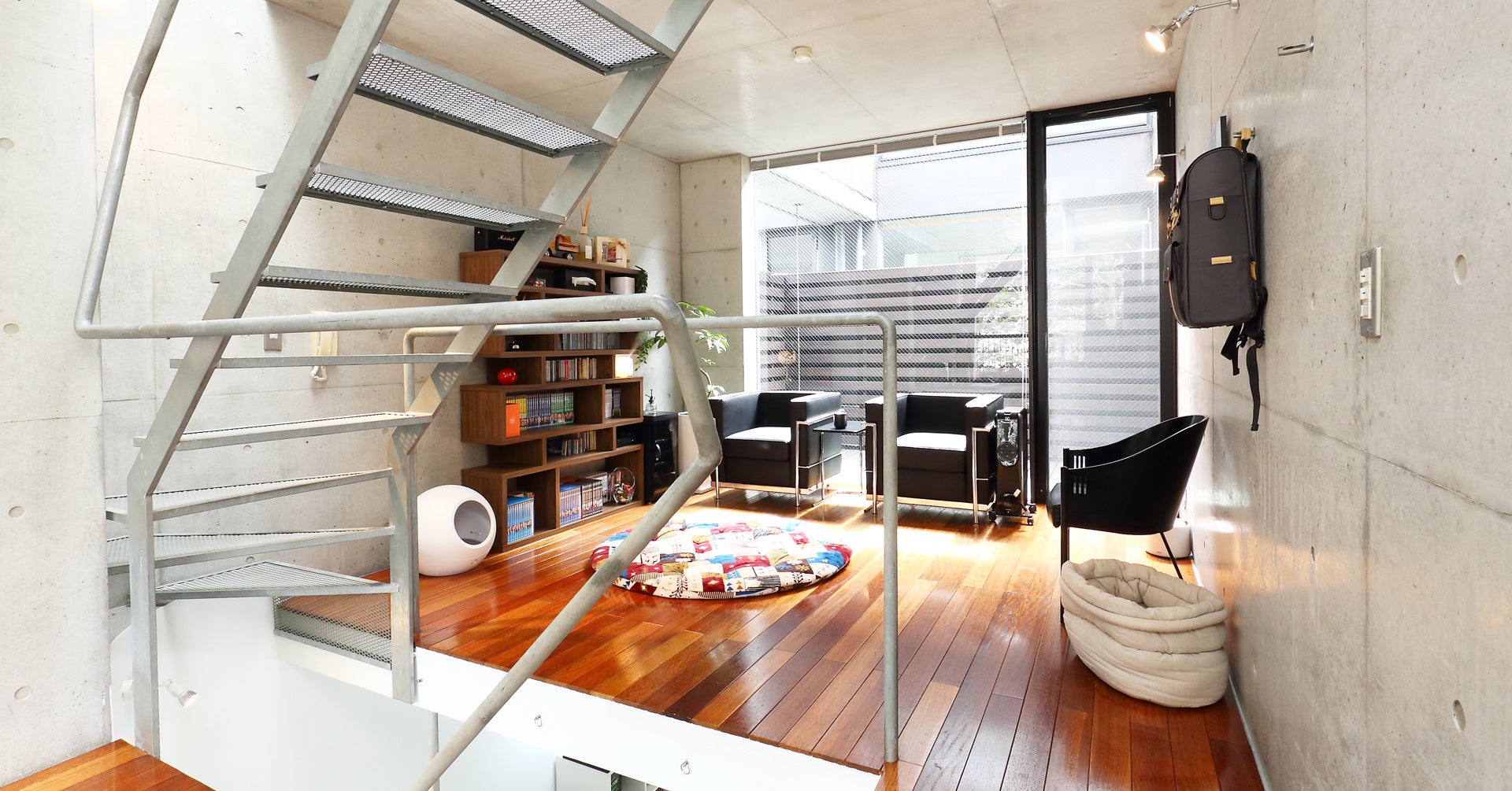 2Fのリビングスペースはインダストリアルな雰囲気のリビングスペースで、北側には大きな嵌め殺しの窓が特徴で、春の桜から秋の紅葉まで四季折々に表情の変わる景色を背景に撮影が楽しめるようになっております。