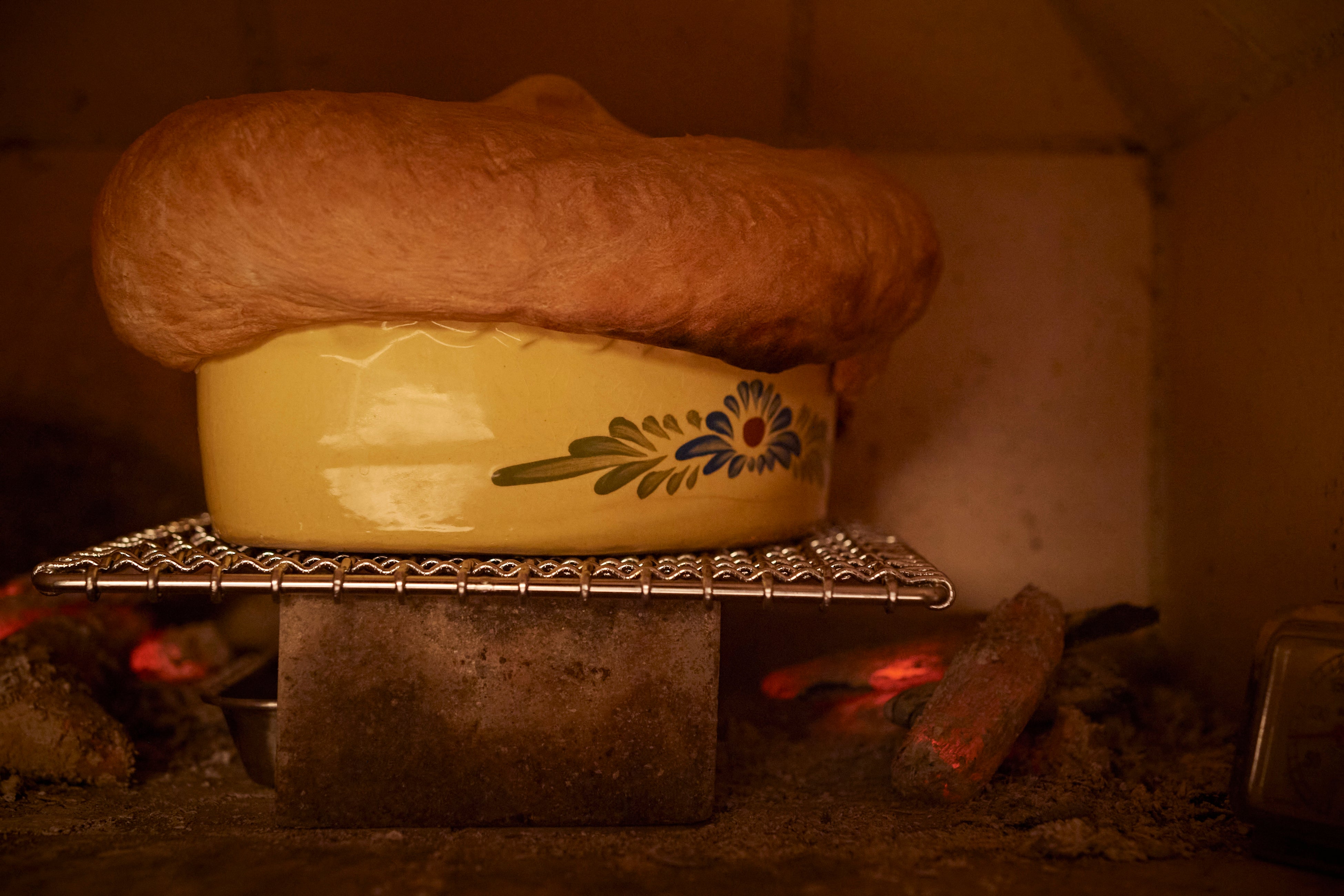 通常の窯と違い、炭を熱源に、窯業の粘土素材で構築された輻射熱を利用して調理する石窯です。