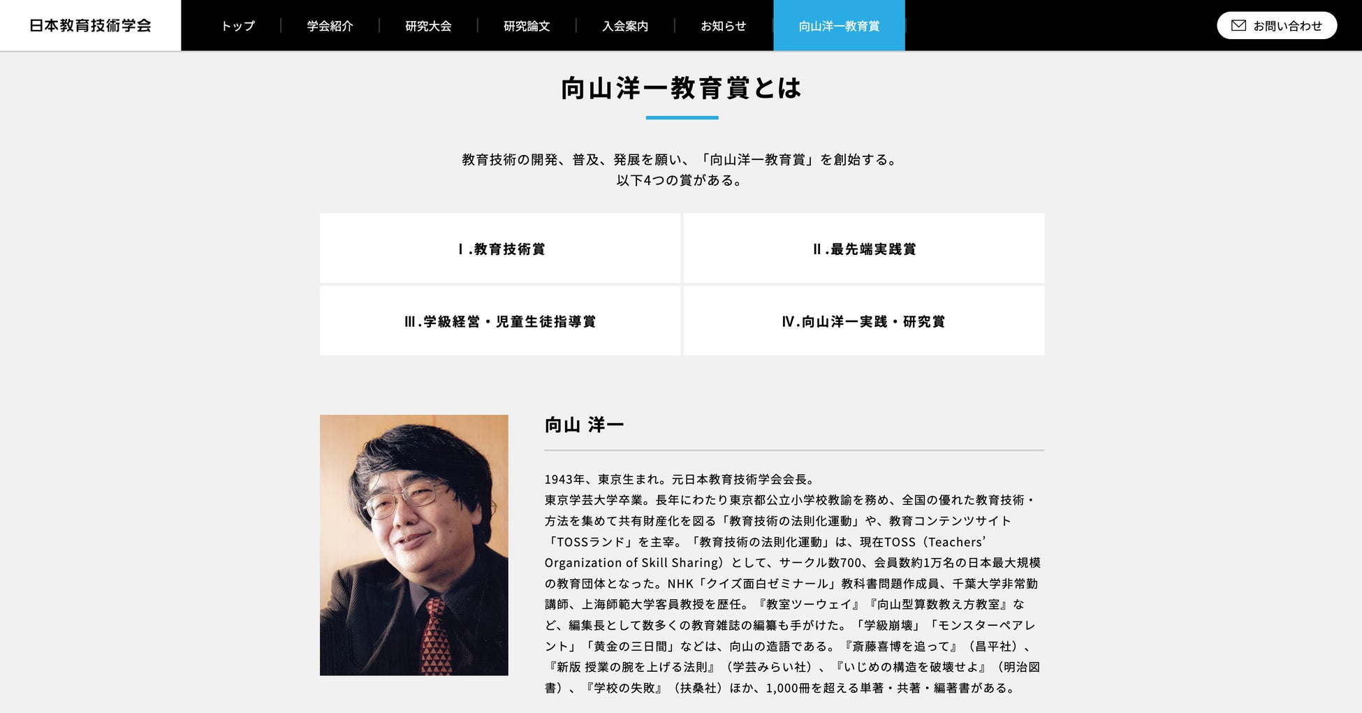 趣 旨:教育技術の開発、普及、発展を願い「向山洋一教育賞」を創設し、以下4つの賞を設ける。