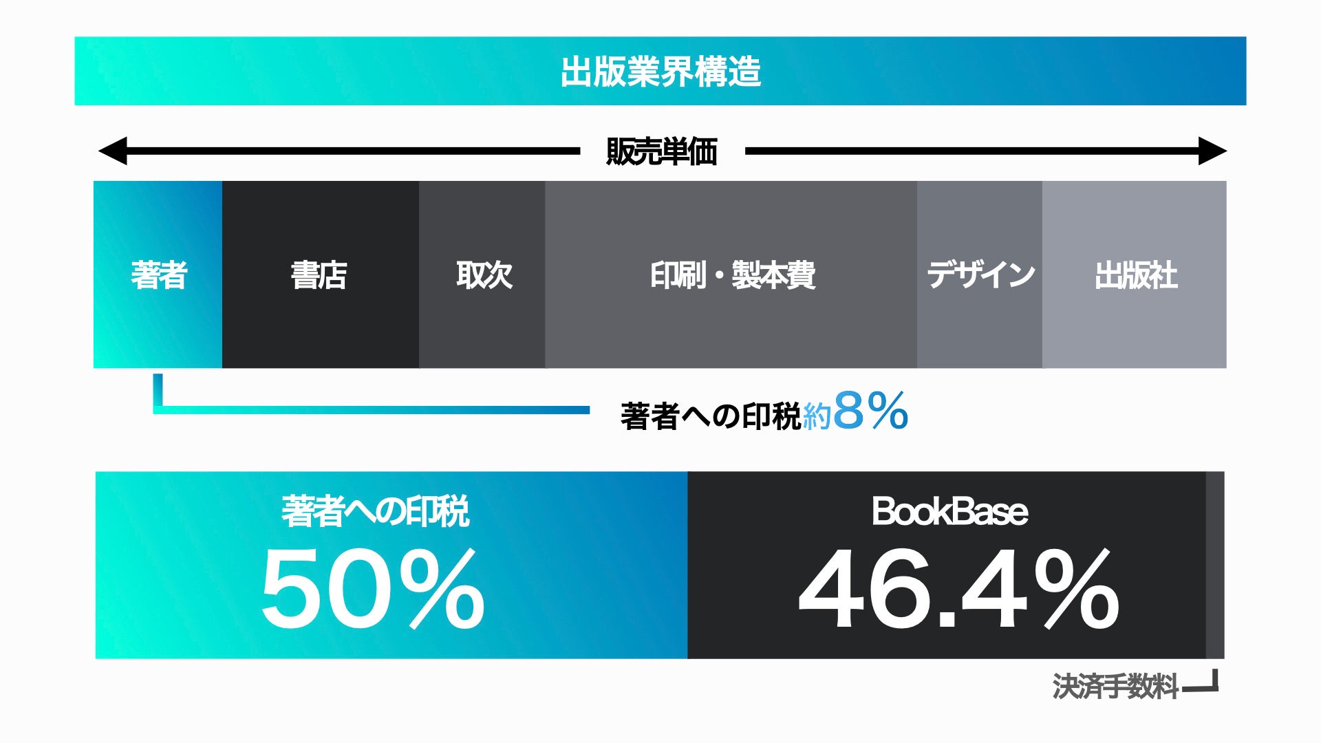 従来の紙をベースとした出版システムでは、作品の作成から販売まで複数の業者が関わることで、コストがかさんでしまいクリエイターに十分な利益を確保することが困難であったという問題がありました。これをBookBaseでは、オンラインにてワンストップで行うことができるシステムとすることで、従来の出版社と同様のサポート体制をつくりながら、印税50%とこれまでの5〜6倍の高還元率を実現しています。