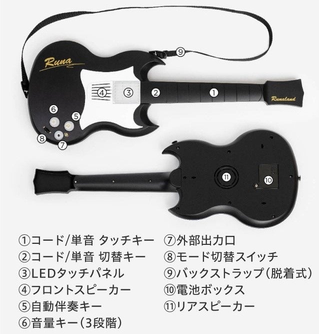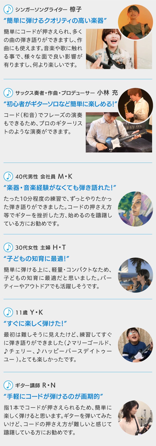 タッチとスワイプだけで、誰でも簡単に弾ける小型電子ギター。単音のみならず、コードやフレーズも弾けるので、弾き語り・作曲・合奏が楽しめます。小型・軽量、電池内蔵のため何処にでも手軽に持ち運べるので、アウトドアやパーティ、お子様の知育にもお勧めです。