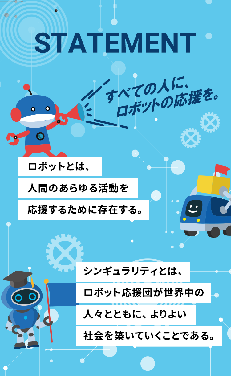 シンギュラリティとは、ロボット応援団が世界中の人々とともに、よりよい社会を築いていくことである。