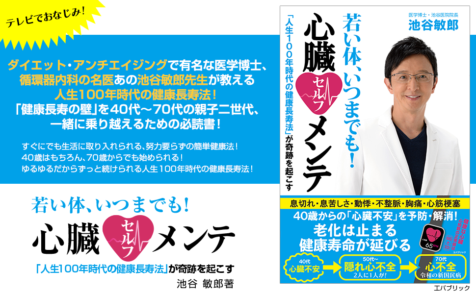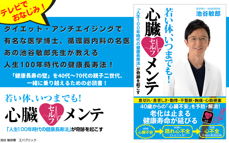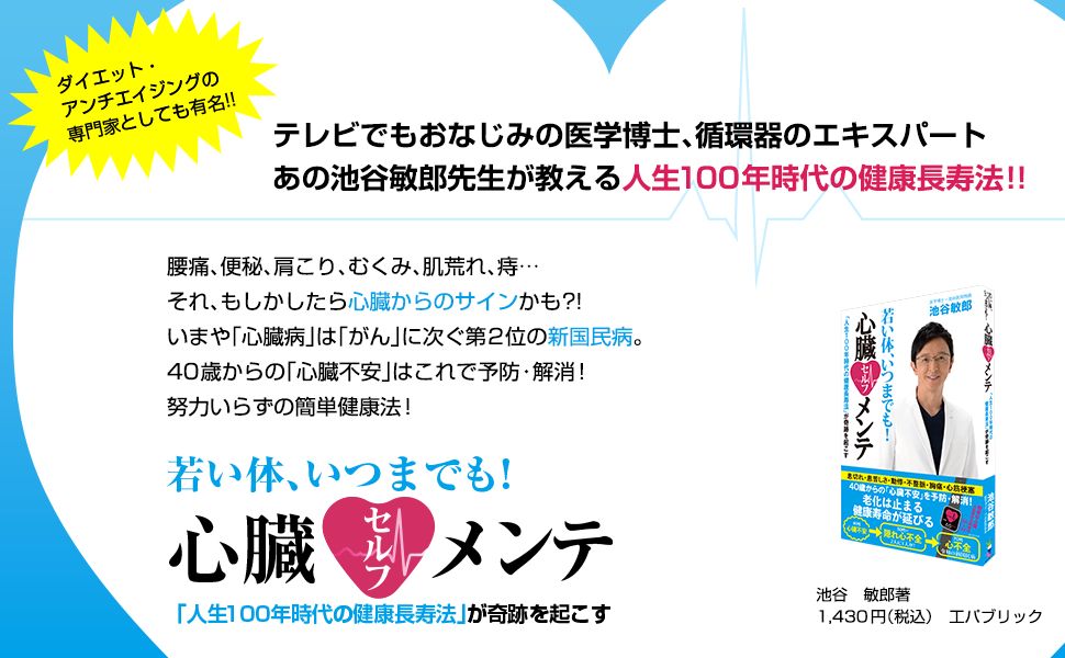 ダイエット・アンチエイジングの専門家としても有名な、テレビでおなじみの医学博士、あの池谷敏郎先生が教える人生100年時代の新・健康法「若い体、いつまでも!心臓セルフメンテ」が7月31日発売!