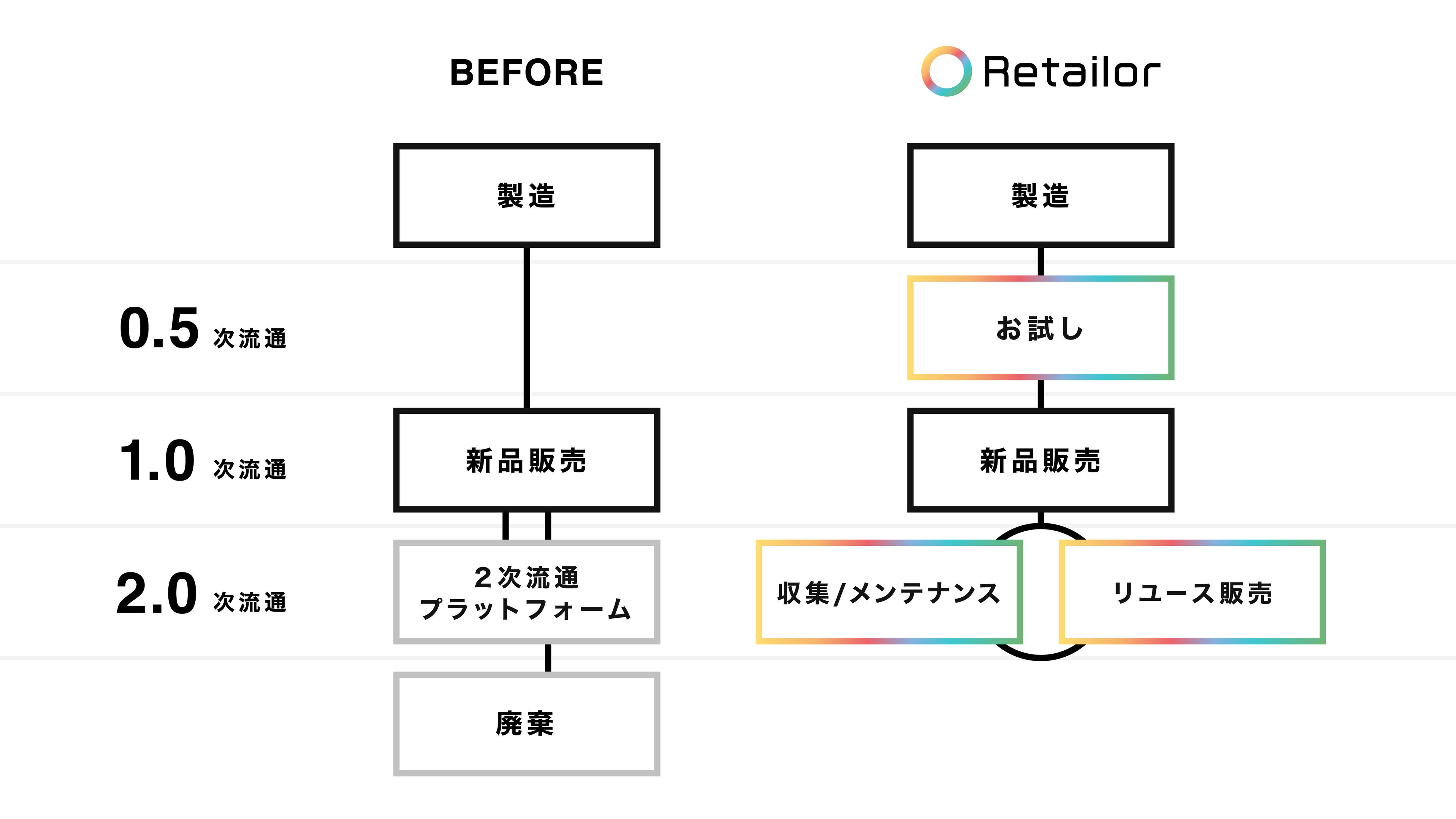 「リテーラー」は「自社ECサイト上に」お試し・リユース機能を実装できる点が大きな特徴です。外部のプラットフォームに出すわけではないため、お試し注文の売上やリユース品の販売分が、ブランド側に還元されていきます。つまり、二次流通市場から一次生産者のブランドが新たな収益を生めるようになります。