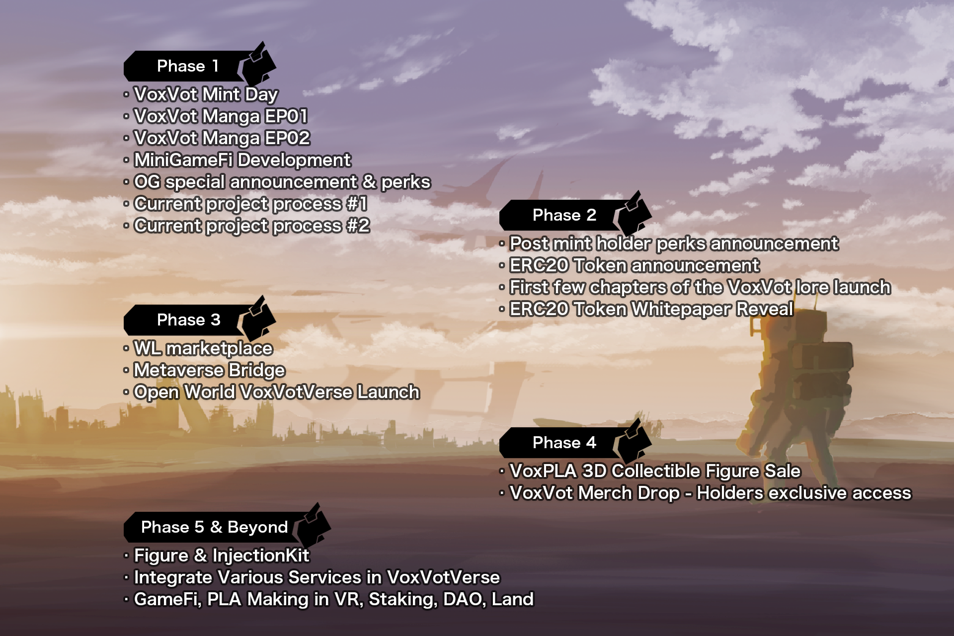 ロードマップとしては、NFT、漫画、ERC20トークンの発行、GameFi、WLマーケットプレイス、フィギュア及びインジェクションキットの販売などを経てメタバース空間『VoxvotVerse』展開、トークンエコシステムの構築が目標です。