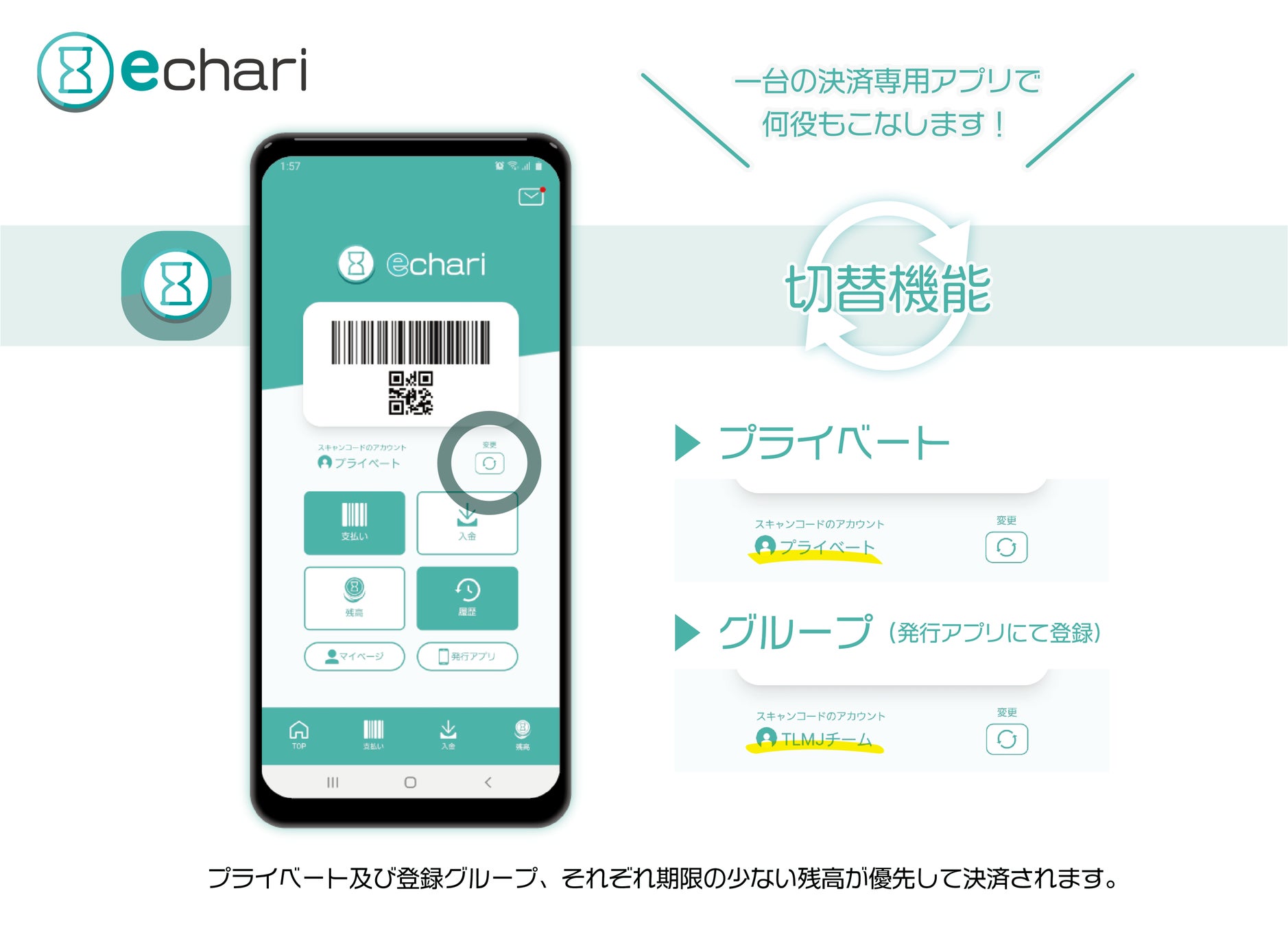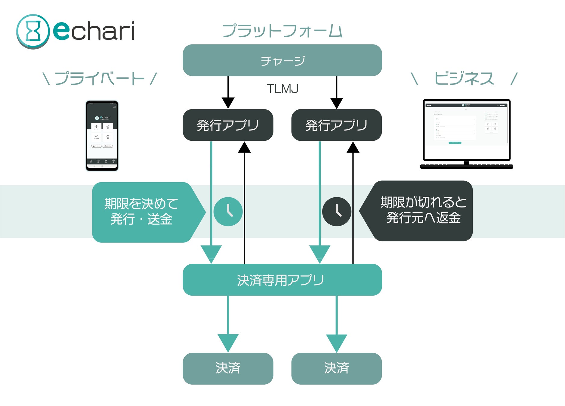モバイル決済事業のスタートアップであるTLMJ株式会社は、期限をつけて発行送金できる「 発行アプリ 」、別財布のように切替決済が出来る「 決済専用アプリ 」などで構成するプラットフォーム詳細を発表いたします。併せてこのキャッシュレスのプラットフォーム『 echari 』ベータ版をリリースした事をお知らせします。