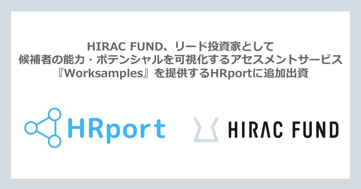 HIRAC FUND、リード投資家として候補者の能力・ポテンシャルを可視化するアセスメントサービス『Worksamples』を提供するHRportに追加出資