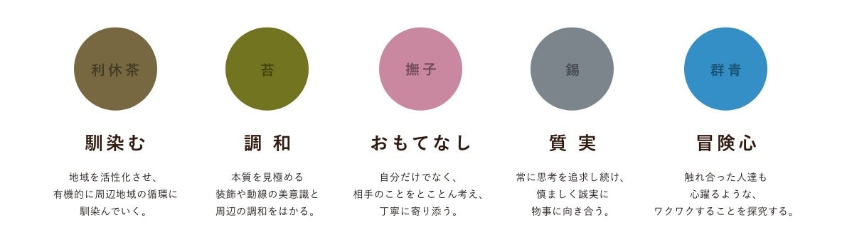 プロジェクトの核となるキーワードを定義しています。長期的な運営を目指し、地域に馴染みながら、美意識を持って収益を上げていく朝日興業らしいキーワードです。