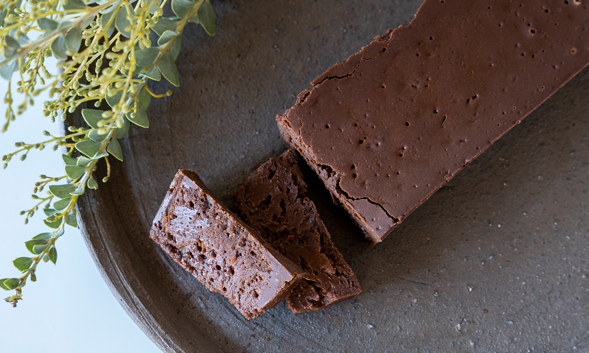 贅沢なカカオに、日昇堂伝統のあんを合わせたしっとりとしたチョコレートテリーヌです。濃厚な味わいの奥深くに広がる、和の甘みをお楽しみください。