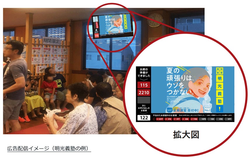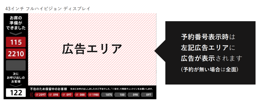特に「予約番号表示」「呼出番号表示」との同一画面表示にてサイネージに必然的に目が向く仕組みのため、視認率の高さが期待できます。また、1店舗から実施可能なため、地域密着媒体としての活用も可能です。