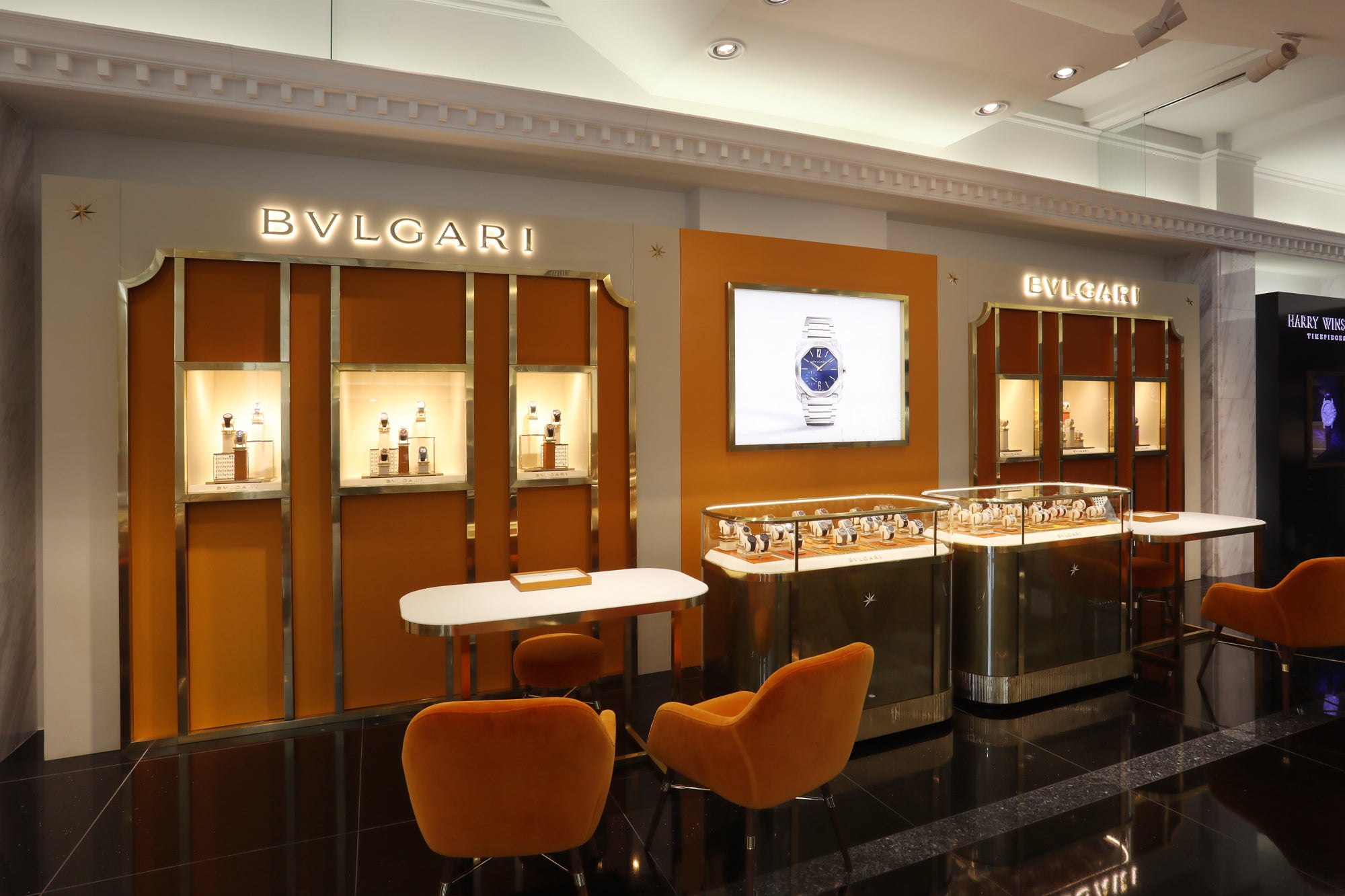 ゆったりと商品を選ぶことのできるショーケースに、落ち着いて商談のできるテーブルを2か所に備えた広々としたコーナーは、時計専門店のブルガリコーナーとしては地域最大級です。