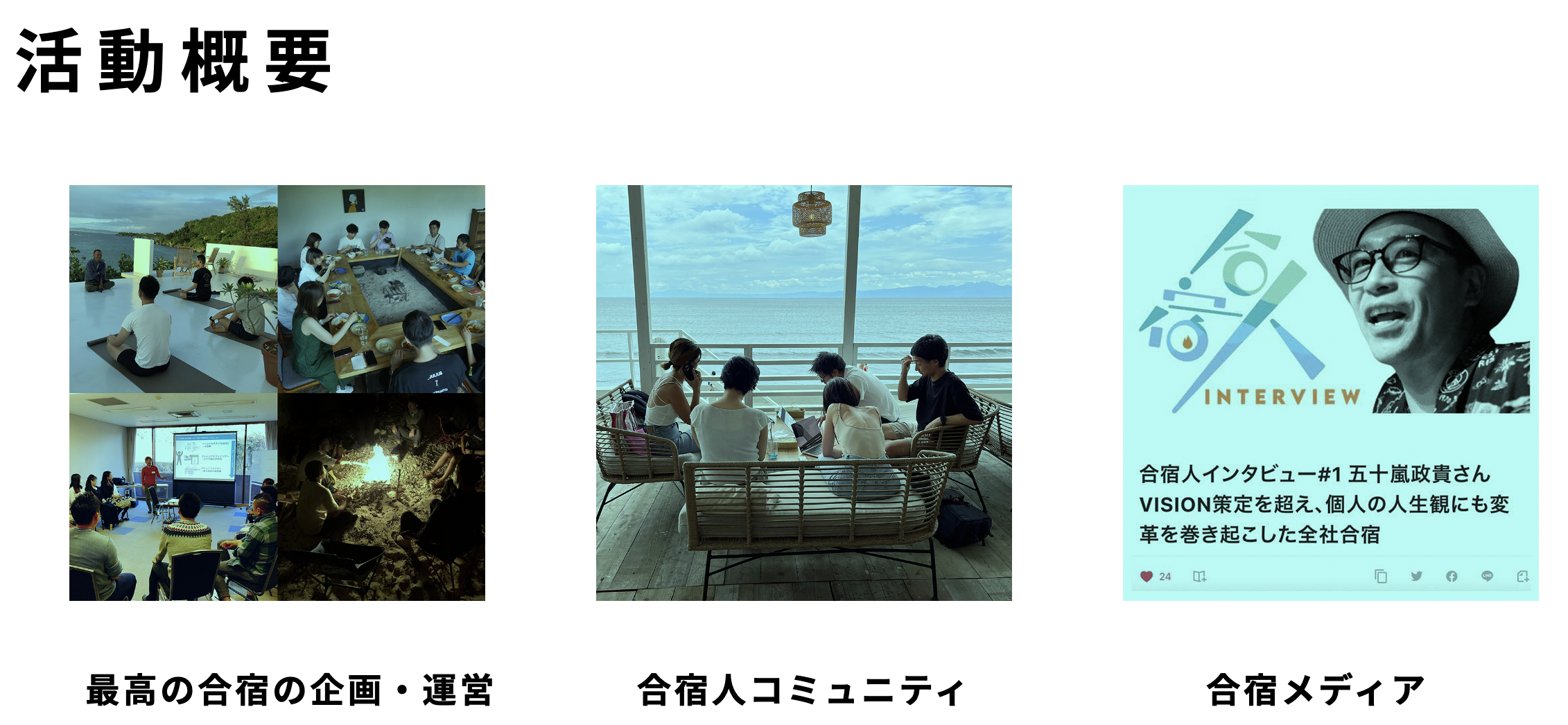 合宿を企画・実施するリーダーである「合宿人」のコミュニティを広げ、最高の合宿にまつわるストーリーやナレッジを発信していきます。