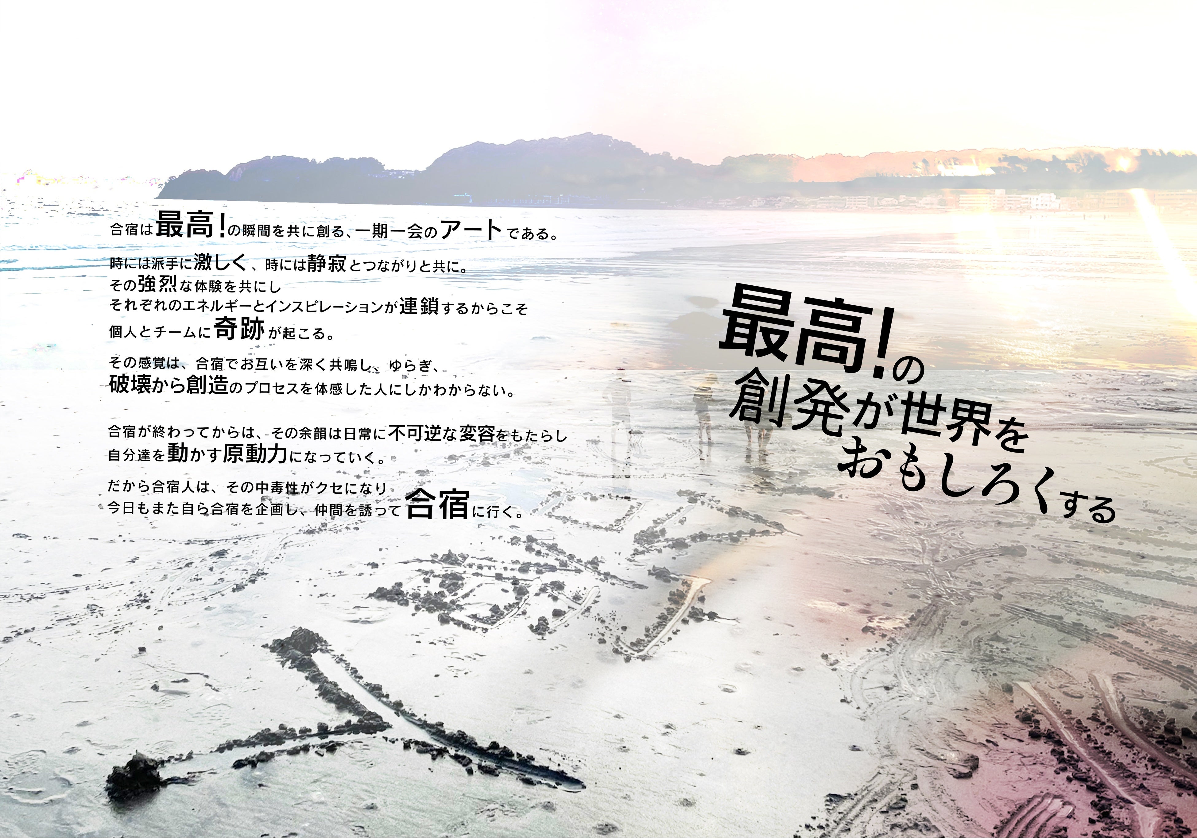 この合宿が好きで、最高の合宿体験から自分やチームに変革を起こす人たちを「合宿人」と呼び、最高の合宿を提供すると共に、その体験ストーリーとナレッジを集めて発信することを通して、最高の合宿というムーブメントから文化をつくっていきます。