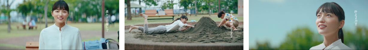 CMは川口春奈さんが演じる女性社員が休憩のために立ち寄った公園のベンチで、男の子が砂場で1人遊んでいるシーンからスタートします。男の子は砂場でトンネルを作ることに何度もチャレンジしますが、うまくいきません。その姿を見た川口さんが、「誰もが無理だと言う『難所難物』にもおそれず挑む」という彼女の初心に気づかされ、男の子と一緒に砂場で寝転びながらトンネルを作り始めます。やがてトンネルが完成し、他にもダムや建物も出来上がり砂場に立派なまちが出来上がるというストーリー展開になっています。