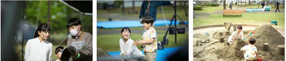 実際の公園の砂場に、熊谷組が手掛けるまちづくりをイメージしたセットを制作し、撮影は行われました。天候が心配されるまさに『難所難物』の撮影現場においても、監督の説明に真摯に耳を傾け、表現力豊かに演技されていました。また撮影の合間には、共演した子役の方に声をかけるなど、明るく一丸となって撮影ができるよう、まわりにも気を配ってくださる姿が印象的でした。