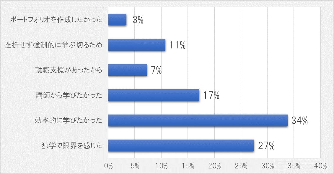 また、最後まで学び切るためであったり、就職支援があったためという理由もランクインしています。ポートフォリオを作成したかったという理由と総合して考えると、習得したい、キャリアプランに役立てたいと考えている人が多いことが分かります。