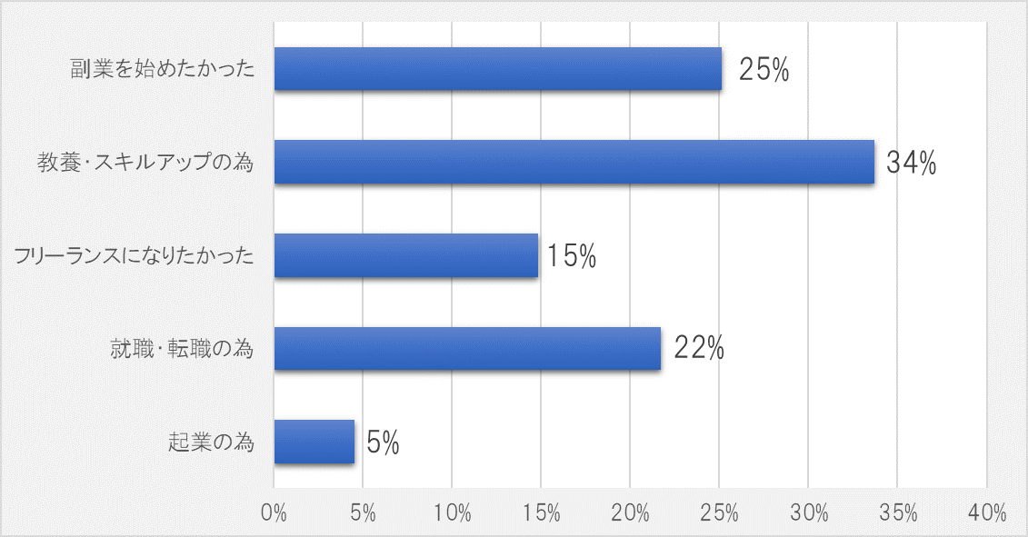 そのほかにも就職や転職、起業、フリーランスとしての独立を視野に入れた受講目的がみられ、プログラミングがキャリアプランに関わる項目であることが分かります。