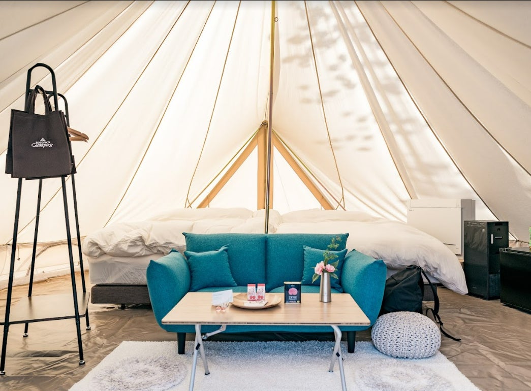 「sotonico」は、一日一組限定の貸し切りで山形の「自然」と「食」を心ゆくまで堪能できるグランピング施設です。広々としたベルテントの中にはシモンズ社製のダブルベッドが2台、管理棟には天然木のヒノキ風呂と広々とした洗面台など、快適なファシリティを完備しており、キャンプ初心者やお子様連れのファミリーも安心してお過ごしいただけます。