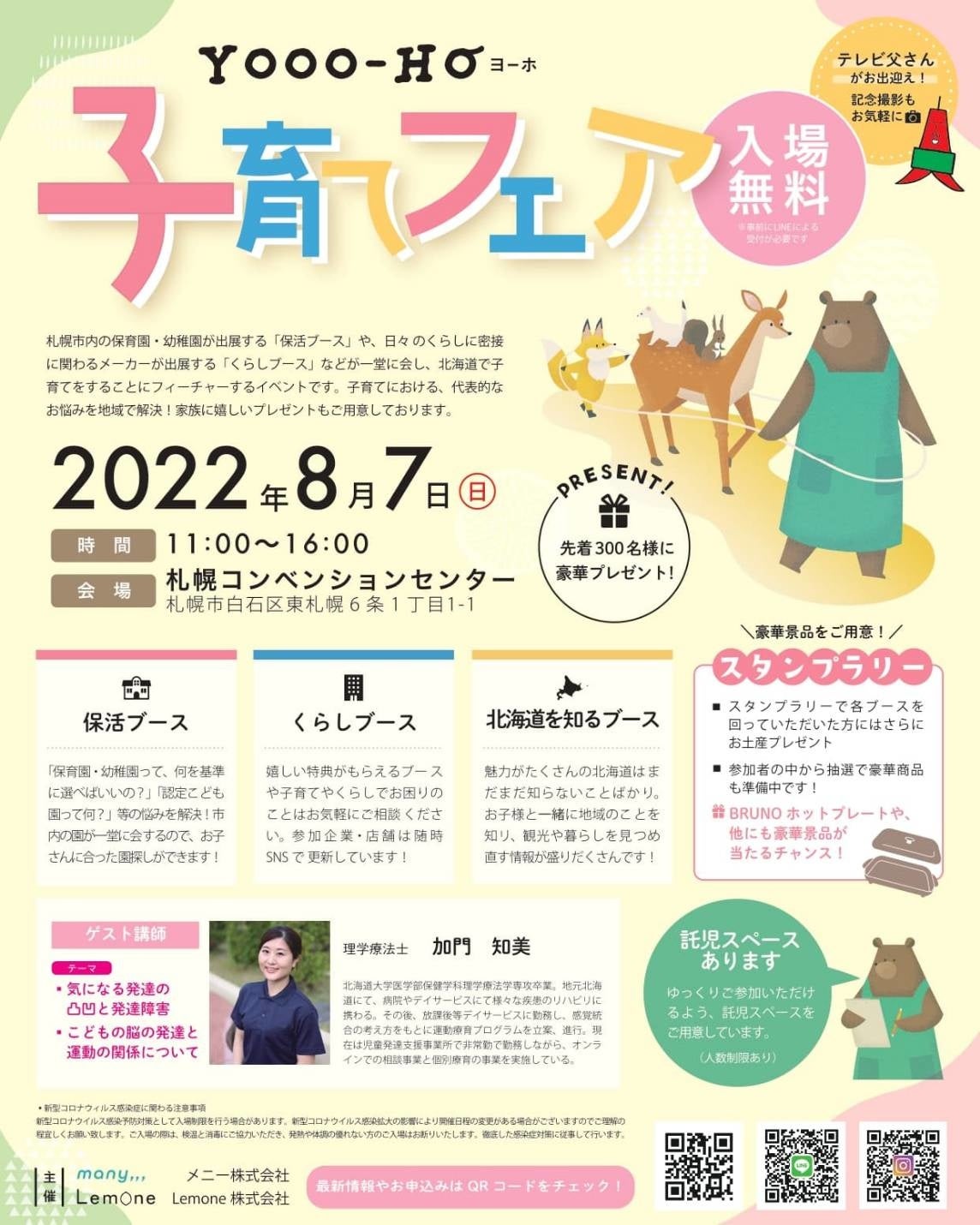 Lemone株式会社、メニー株式会社の共催で、札幌市内の保育園・幼稚園や子育てを支援する商品・サービスが一同に集まる、子育て世代向けのフェア「Yooo-Ho(ヨーホ) 子育てフェア」を2022年8月7日(日)11時から札幌コンベンションセンターにて開催