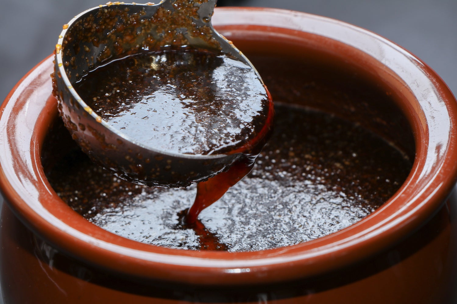 創業100年を誇る福岡県の老舗醸造所の醤油をベースに使用。この醤油が持つ旨味と甘みに、韓国青陽産唐辛子でアクセントをつけ、しっかりと熟成させました。ごはんとの相性を第一に考えた「究極のタレ」です。