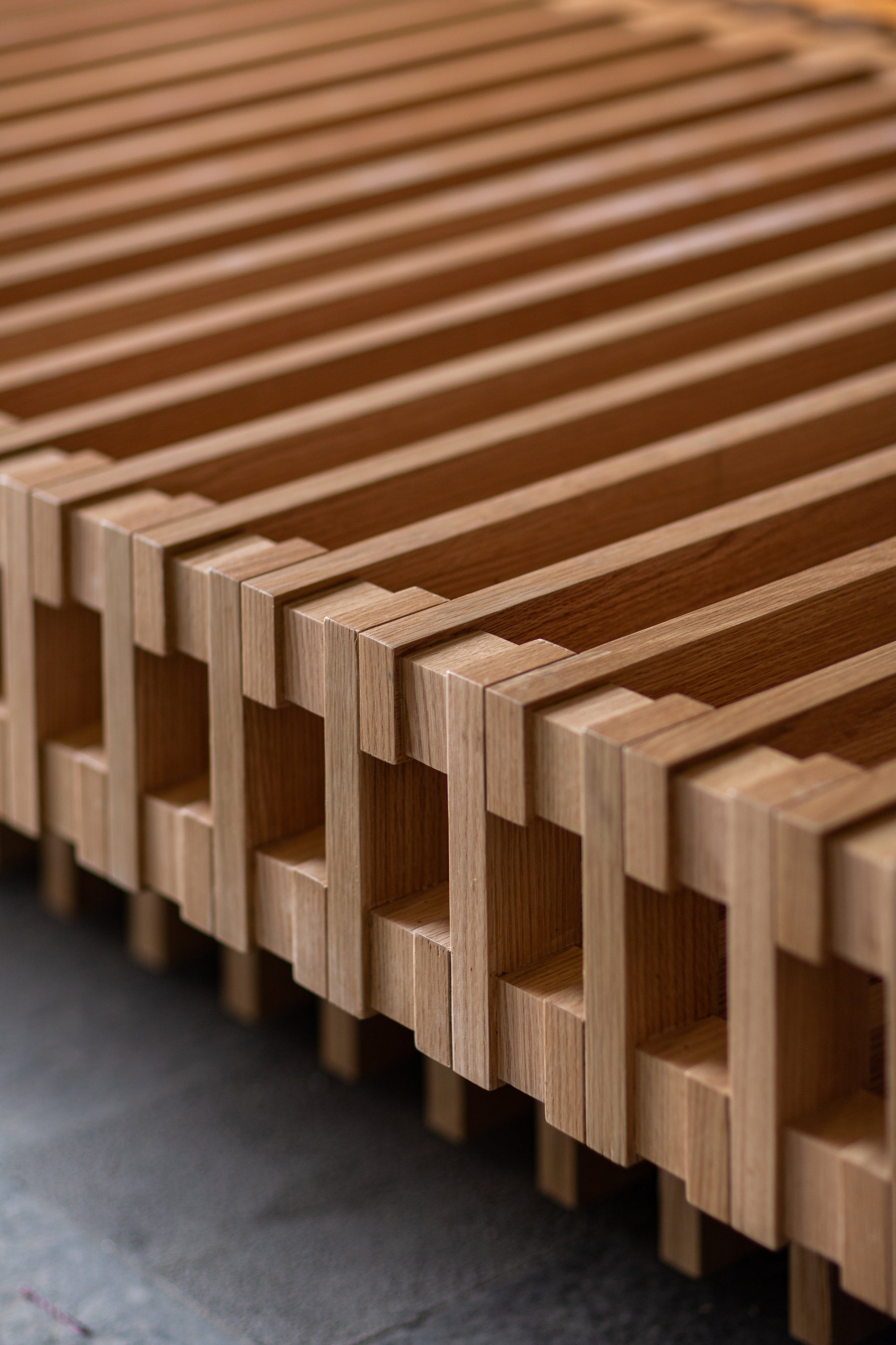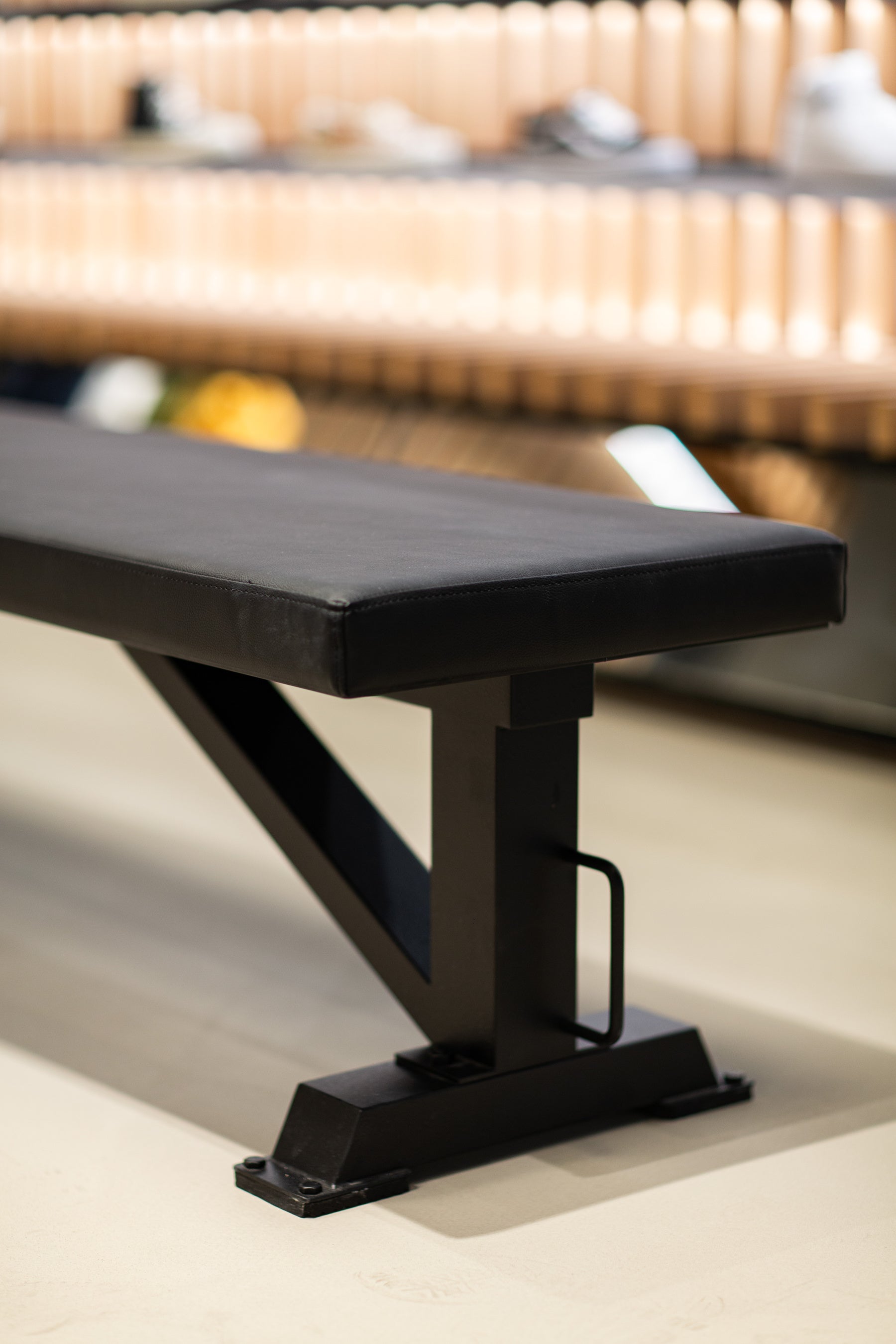 エントランス大テーブルは、廃棄されるバスケットボールのバックボードをカットし、特殊な工程で組み立てたもので、環境に配慮しながらもブランドのスポーティなDNAを表現。