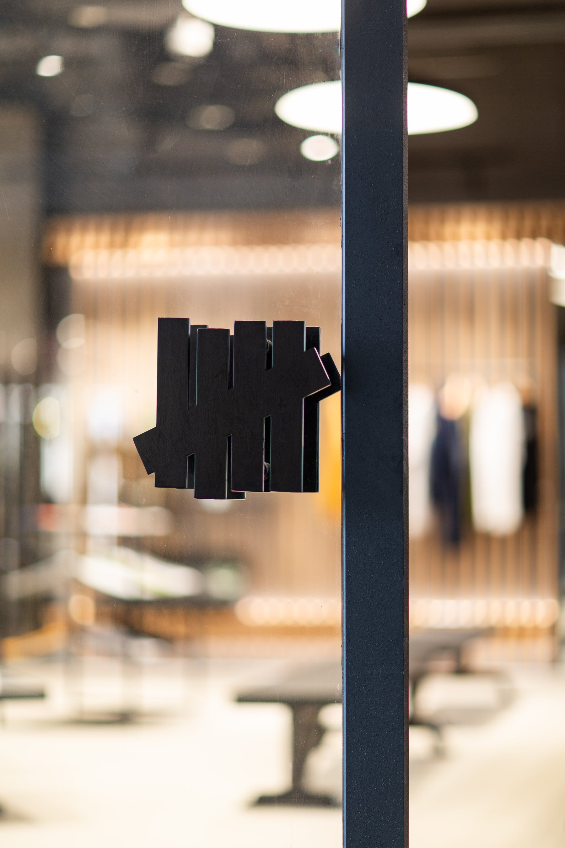 ショップのファサードや什器には、UNDEFEATEDの美学である黒に、さらにドライな無骨感を演出するために、ミリタリーやアウトドアスポーツ車などで使用される粒子の荒い粉体塗装を施している。