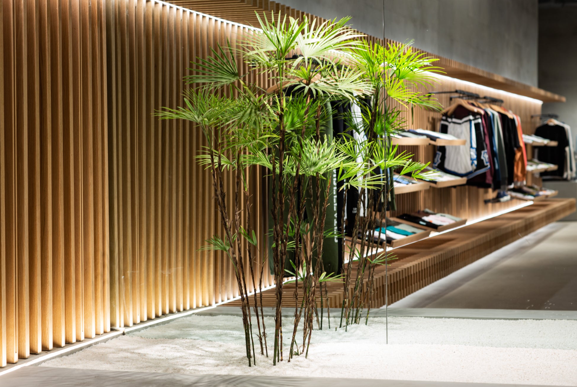上海店のオリジナルである"East meets West "という文化的なコンセプトを織り込み、アジアの「禅」の精神を感じさせる「枯山水」や木の装飾が、スポーティなブランドらしさとミックスされ新しい価値観を提案。