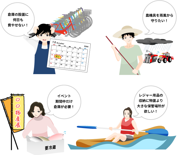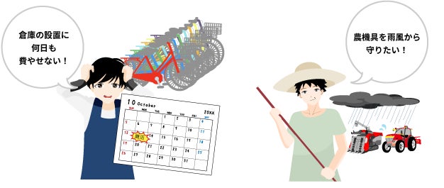 - 「プレハブ倉庫の建設を待てない」、「小さな物置には入らない」の悩み解消