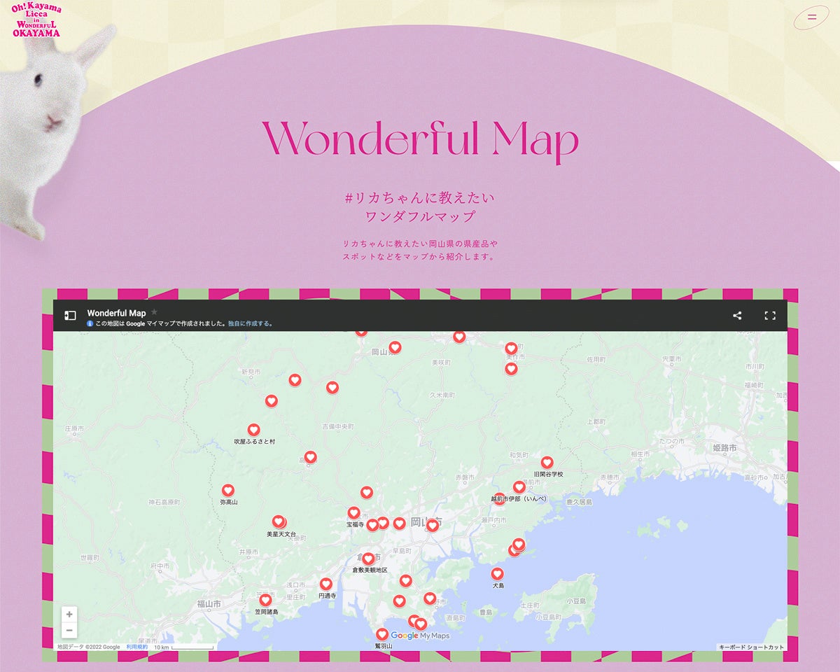 リカちゃんが訪れたり、みんながリカちゃんに教えたい岡山の魅力の一部を地図に落とし込んだ「Wonderful Map」を特設サイト内に設置しました。